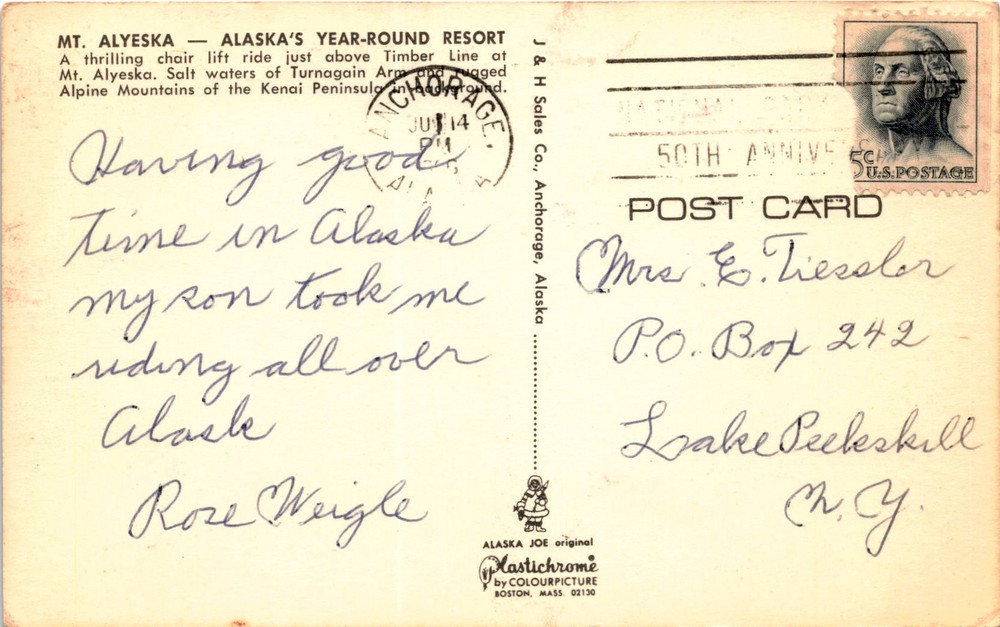 MAKE AN OFFER. THE MORE YOU BUY THE BETTER DEAL I WILL ACCEPT The postcard features an image of Mt. Alyeska, Alaska's year-round resort, showcasing a thrilling chair lift ride just above the Timber Line. Mt. Alyeska is a popular destination for skiing, snowboarding, and other winter sports, with stunning views of the surrounding landscapes.