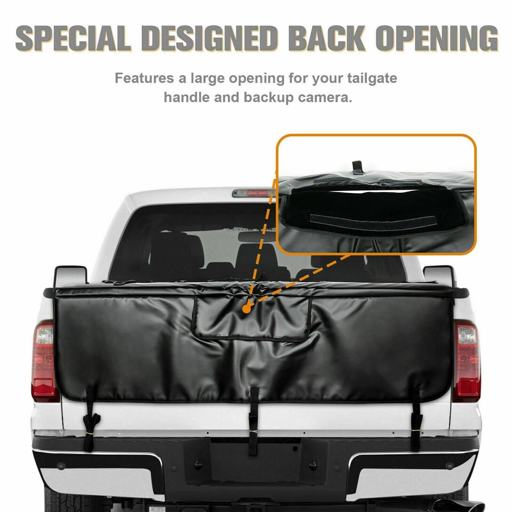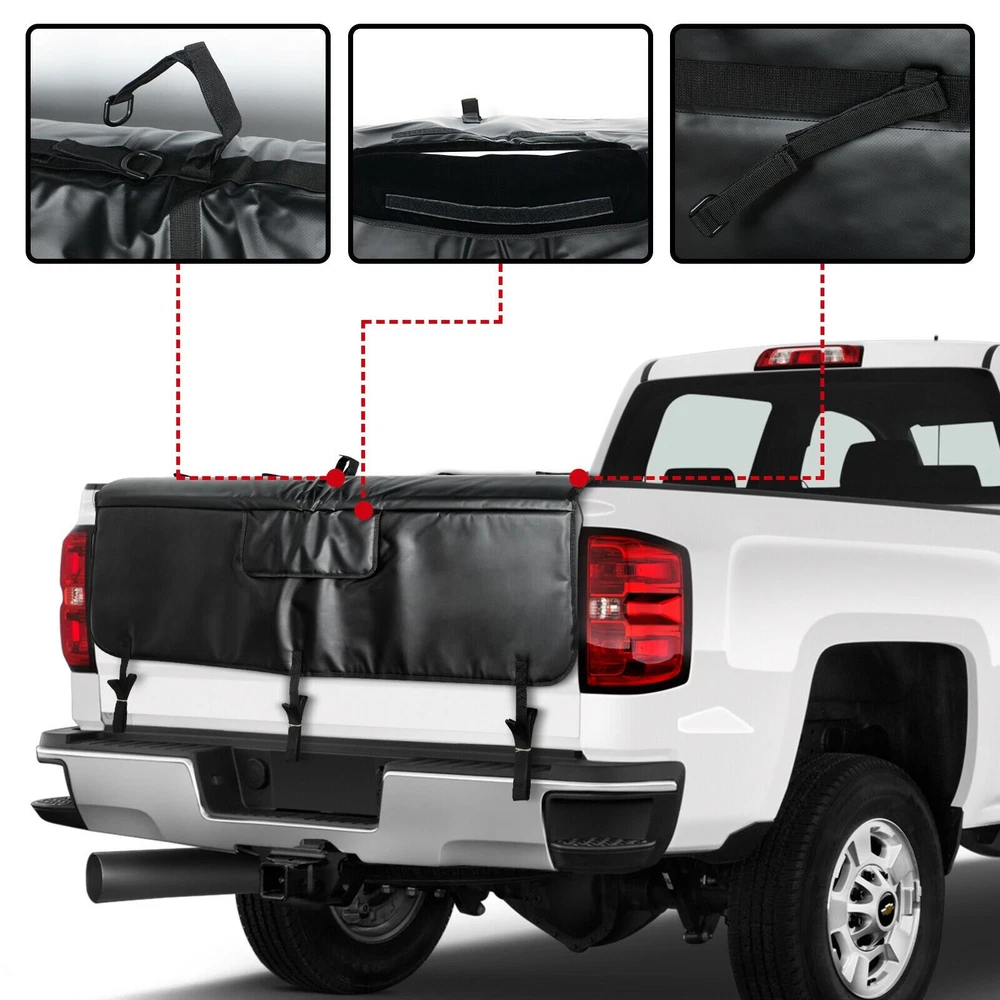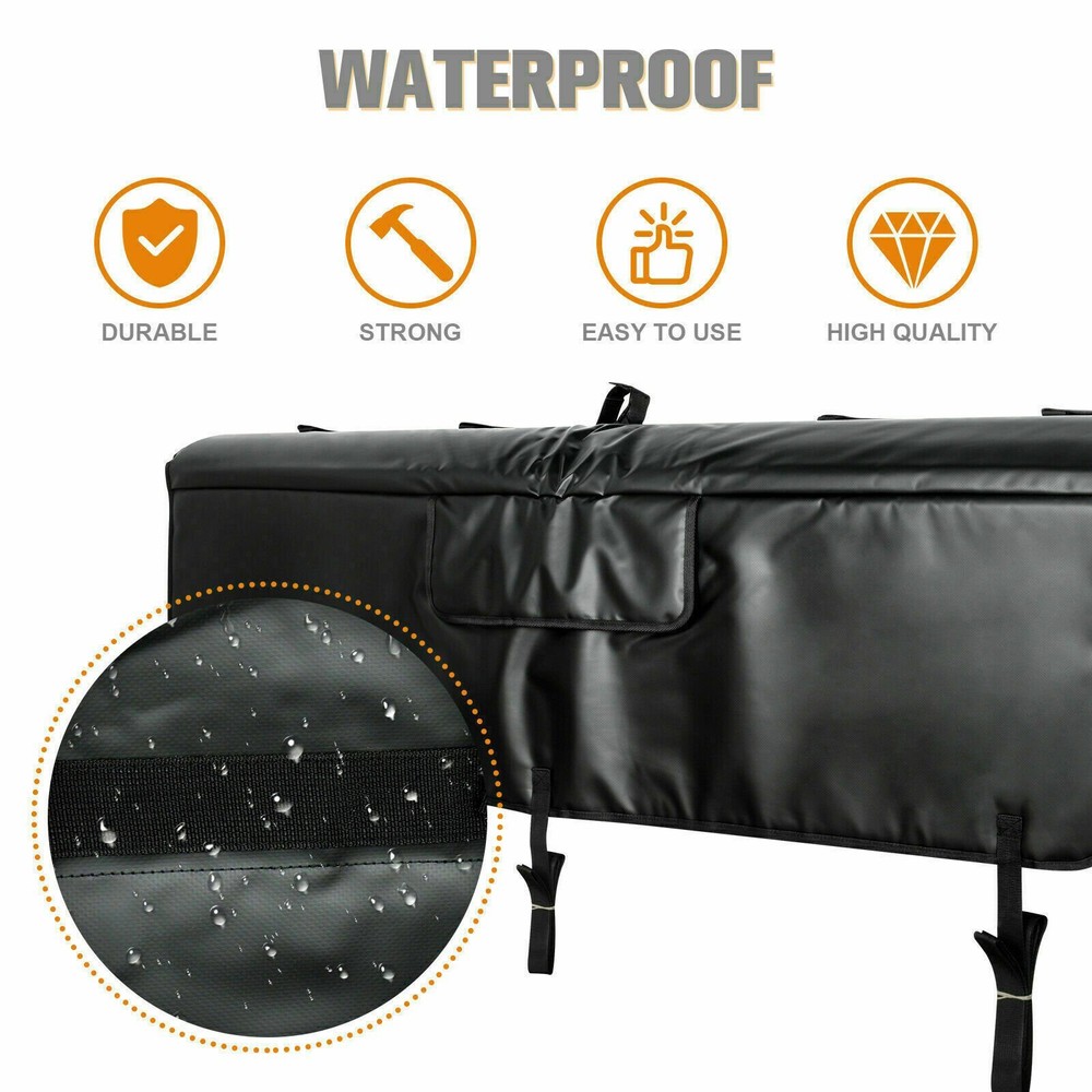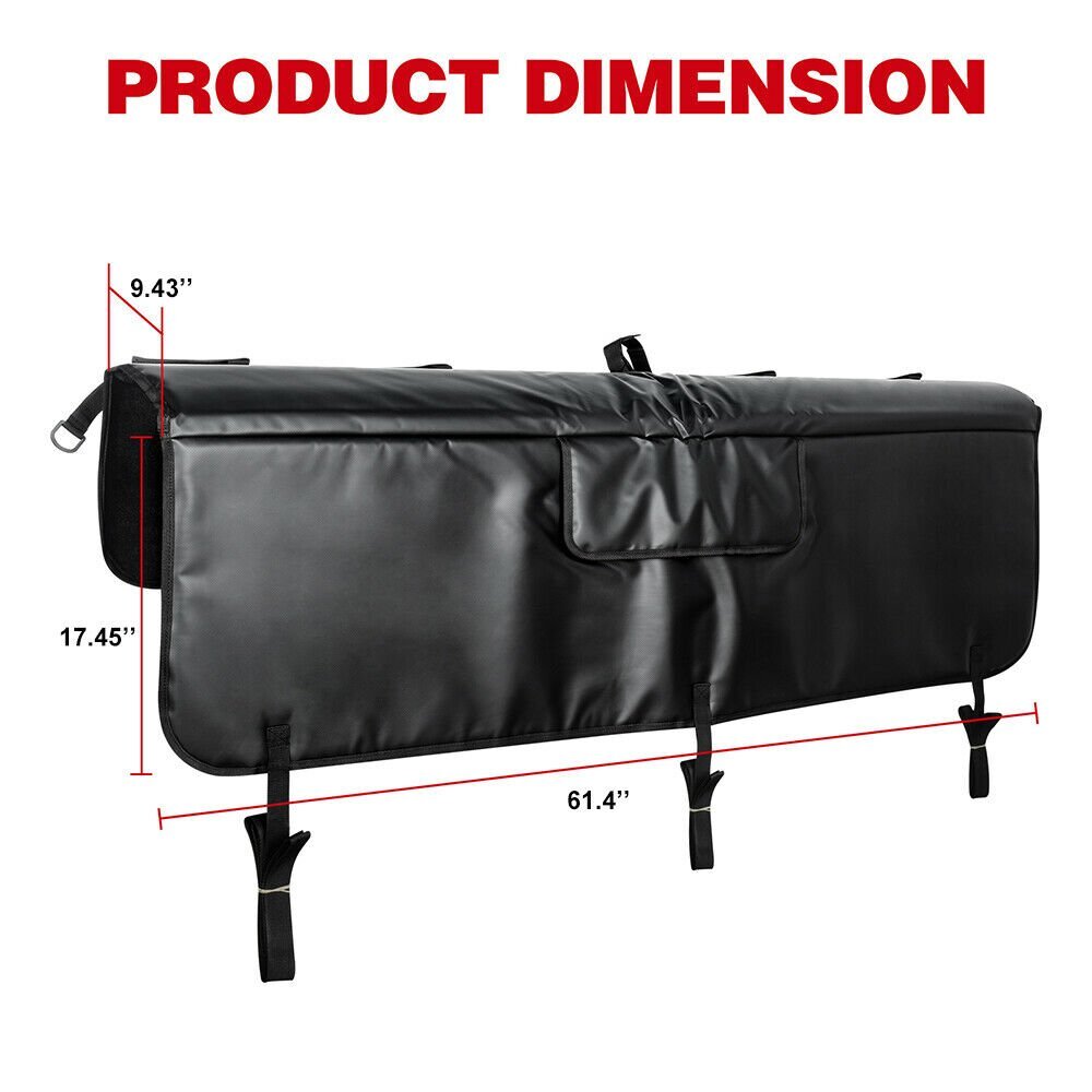 Description: Easily convert the tailgate of most small to mid size trucks into a working 6 bike rack. Protects bikes and trucks for quick transport. Access flap to reach tailgate release handle. Works with most all bikes. Features: Carries up to 6 bikes Designed for mountain bikes but works with most bike styles Includes straps for securing to tailgate Access flap allows access to tailgate release while pad is attached Uses less space in truck bed than other carriers - leaves more room for other gear, protect bikes and truck tailgate paint Compatible with most trucks Extra padding where it counts Least expensive way to carry 6 bikes Also protects truck when hauling surfboards, kayaks, construction supplies, and more Specifications: Condition: New with high quality Size: Big 61.4'' Color: Black Material: PVC Tarp (waterproof), foam padding Package Included: 1x Tailgate Shuttle Pad