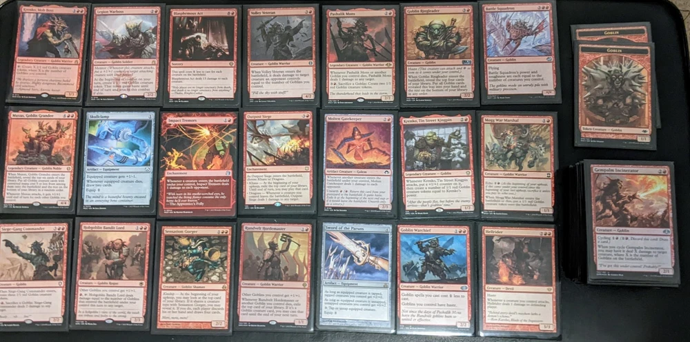 Two near mint 100 card commander decks. The first is a vampire life drain tribal that is the blood rites precon (~$70 base) with some great power upgrades. Play style you pump out vampires that spawn new baddies when they die and can take half your opponents life if any connect. You then gain life equal to damage dealt and vice versa for some fun effects. The second is a goblin krenko tribal that pumps out tokens and powers them up to silly proportions. These two are both a blast and well balanced with each other, my son and I have had tons of back and forth close games with these for a while now. Great set if you're looking for powerful decks that are play tested and well balanced. Last you get 60 bonus cards (most pictured) primarily some valuable Golgari cards I was building decks with. Many cost $5-8 a piece and all pretty powerful and dynamic cards. Happy bidding!