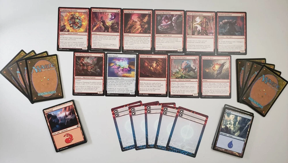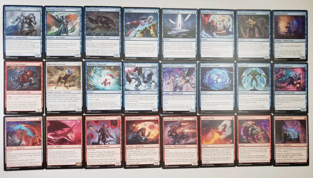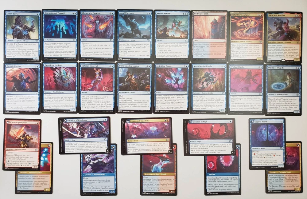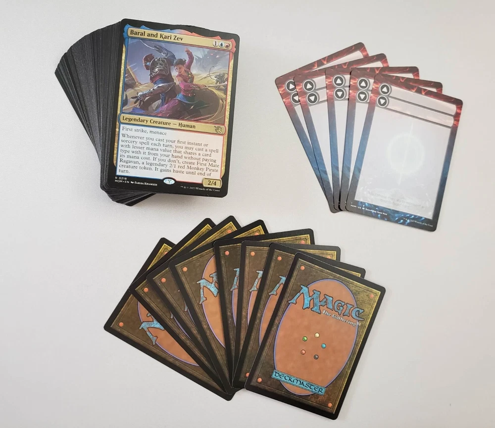 Magic the Gathering Complete Commander EDH Deck Baral and Kari Zev ( Blue / Red ) March of the Machine (April 2023) "One Last Stand! Legendary cards from across your favorite planes have been reprinted together to fight the Phyrexian scourge. Band together for the final fight!" March of the Machine theme decks follow the story of the final stand against the Phyrexian invasion of the multiverse including team-ups between powerful legendary creatures and an all new card type; Battles! You are purchasing a custom, 100-card, ready to play Magic: The Gathering deck that you can bring to your next Commander tournament! All cards in the deck list are included, meaning you will receive a complete deck you can shuffle up and play with. Note that the version (Foil, Showcase, Extended Art, etc) of some cards you receive may vary from the ones pictured, but every version included is tournament legal. Special Offers are automatically applied to all items you add to your shopping cart from the BobmanMTG Store. View your shopping cart before checking out to see your savings. Legal in Commander – Commander is a non-rotating format, meaning the deck will be legal unless cards in the deck are added to the Banned list in the future. You will also receive blank placeholder cards for each double-faced card in your deck. Use in place of Double Sided Cards in your deck if you do not play with card sleeves . Deck List Mystery Cards (8) 3x Random Rare Cards 3x Random Foil Cards 2x Random Common/Uncommon Commander (1) 1x Baral and Kari Zev Creature (26) 1x Akki Scrapchomper 1x Captive Weird 1x Expedition Lookout 1x Furnace Host Charger 1x Furtive Analyst 1x Halo-Charged Skaab 1x Halo Hopper 1x Hangar Scrounger 1x Joyful Stormsculptor 1x Karsus Depthguard 1x Khenra Spellspear 1x Oculus Whelp 1x Omen Hawker 1x Onakke Javelineer 1x Oracle of Tragedy 1x Preening Champion 1x Protocol Knight 1x Redcap Heelslasher 1x Saiba Cryptomancer 1x Skittering Surveyor 1x Thrashing Frontliner 1x Thunderhead Squadron 1x Tidal Terror 1x Trailblazing Historian 1x War-Trained Slasher 1x Xerex Strobe-Knight Land (37) 18x Island 18x Mountain 1x Swiftwater Cliffs Instant (13) 1x Artistic Refusal 1x Assimilate Essence 1x Burning Sun's Fury 1x Change the Equation 1x Coming In Hot 1x Ephara's Dispersal 1x Meeting of Minds 1x Moment of Truth 1x Negate 1x Shatter the Source 1x Volcanic Spite 1x Wicked Slumber 1x Zhalfirin Shapecraft Sorcery (5) 1x Eyes of Gitaxias 1x Ral's Reinforcements 1x Searing Barb 1x Temporal Cleansing 1x Wrenn's Resolve Enchantment (4) 1x Astral Wingspan 1x Corruption of Towashi 1x Disturbing Conversion 1x Stasis Field Artifact (3) 1x Beamtown Beatstick 1x Marauding Dreadship 1x Mirran Banesplitter Battle (3) 1x Invasion of Kaladesh 1x Invasion of Kamigawa 1x Invasion of Vryn