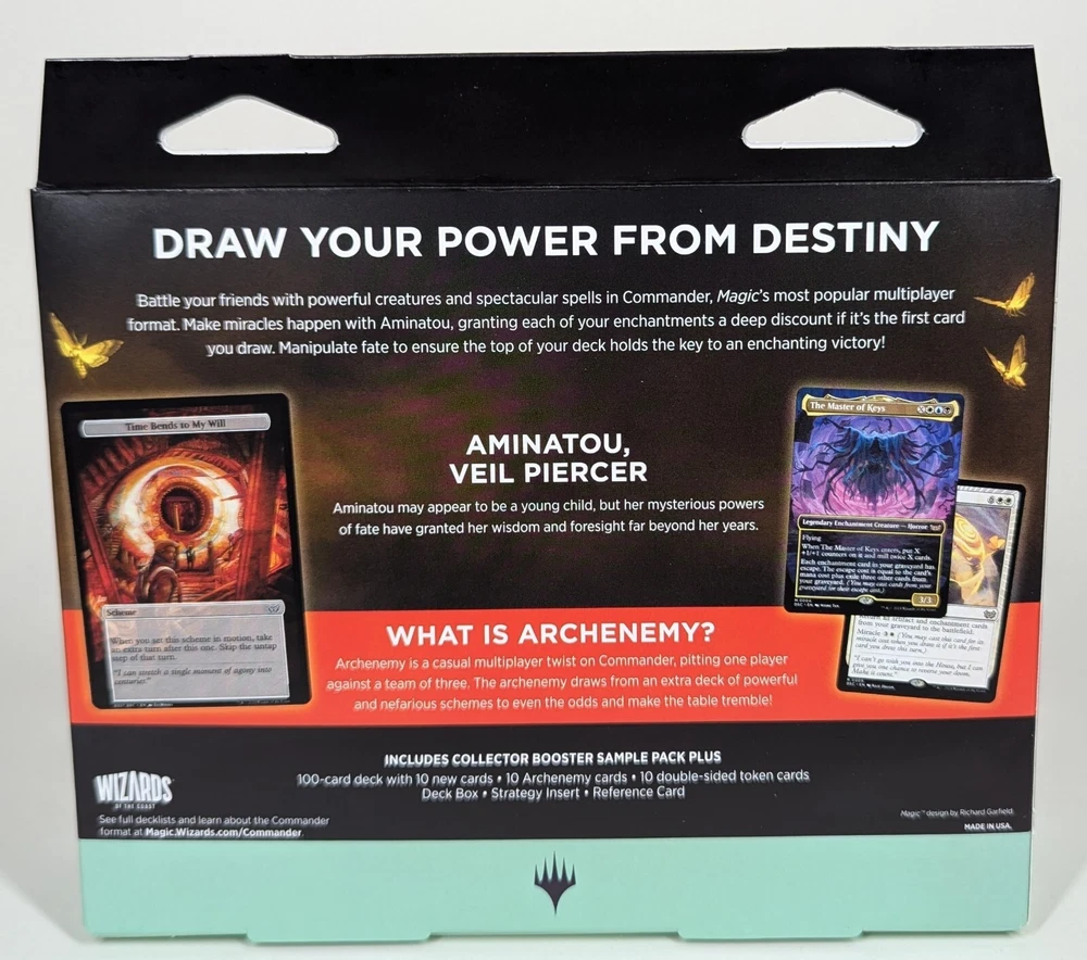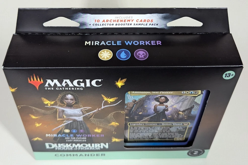 Item : The box pictured is the box you are buying. Factory Sealed. Shipping : Your item will ship the next business day via USPS Ground Advantage. Product Details: Usefate-shifting powers to cast miracles and see a future where you’re the one winning the game. Every Duskmourn: House of Horror Commander Deck includes 2 Traditional Foil Legendary Creature cards featuring spine-tingling Borderless art. Each deck also comes with a 2-card Collector Booster Sample Pack containing 2 cards from the Duskmourn: House of Horror set, including 1 alt-border Rare or Mythic Rare and at least 1 Traditional Foil card. Contents: Each Duskmourn: House of Horror Commander deck includes the following: 1 Ready-to-play 100-card deck, including: 1 Traditional foil borderless face commander 1 Traditional foil borderless feature dcommander 8 New-to-Magic cards 10 Non-foil double-sided tokens 10 Scheme cards for use in the Archenemy format 1 Deck box 1 Duskmourn: House of Horror Collector Booster Sample Pack 1 Life wheel 1 Strategy insert