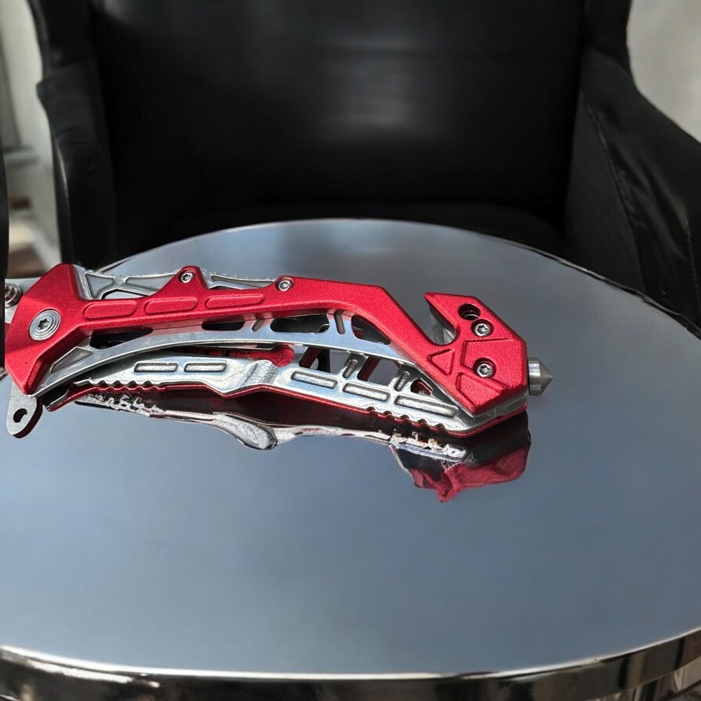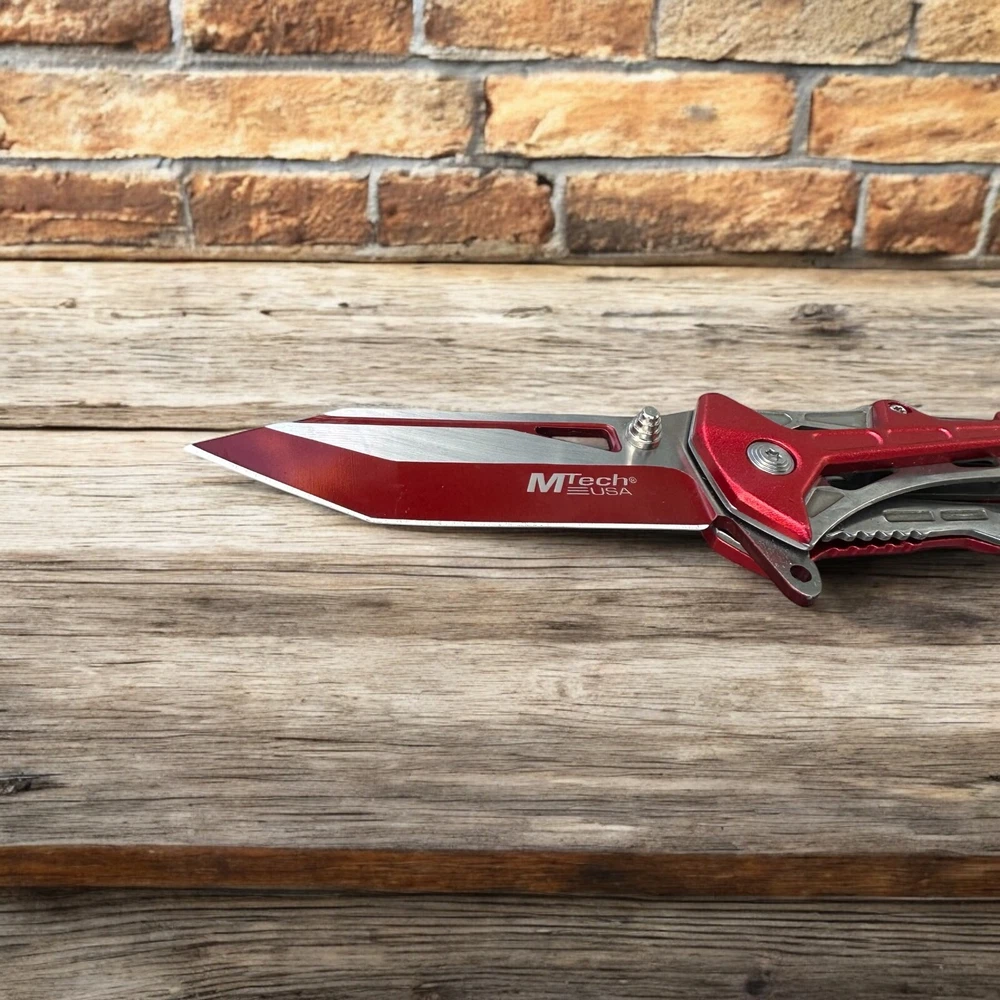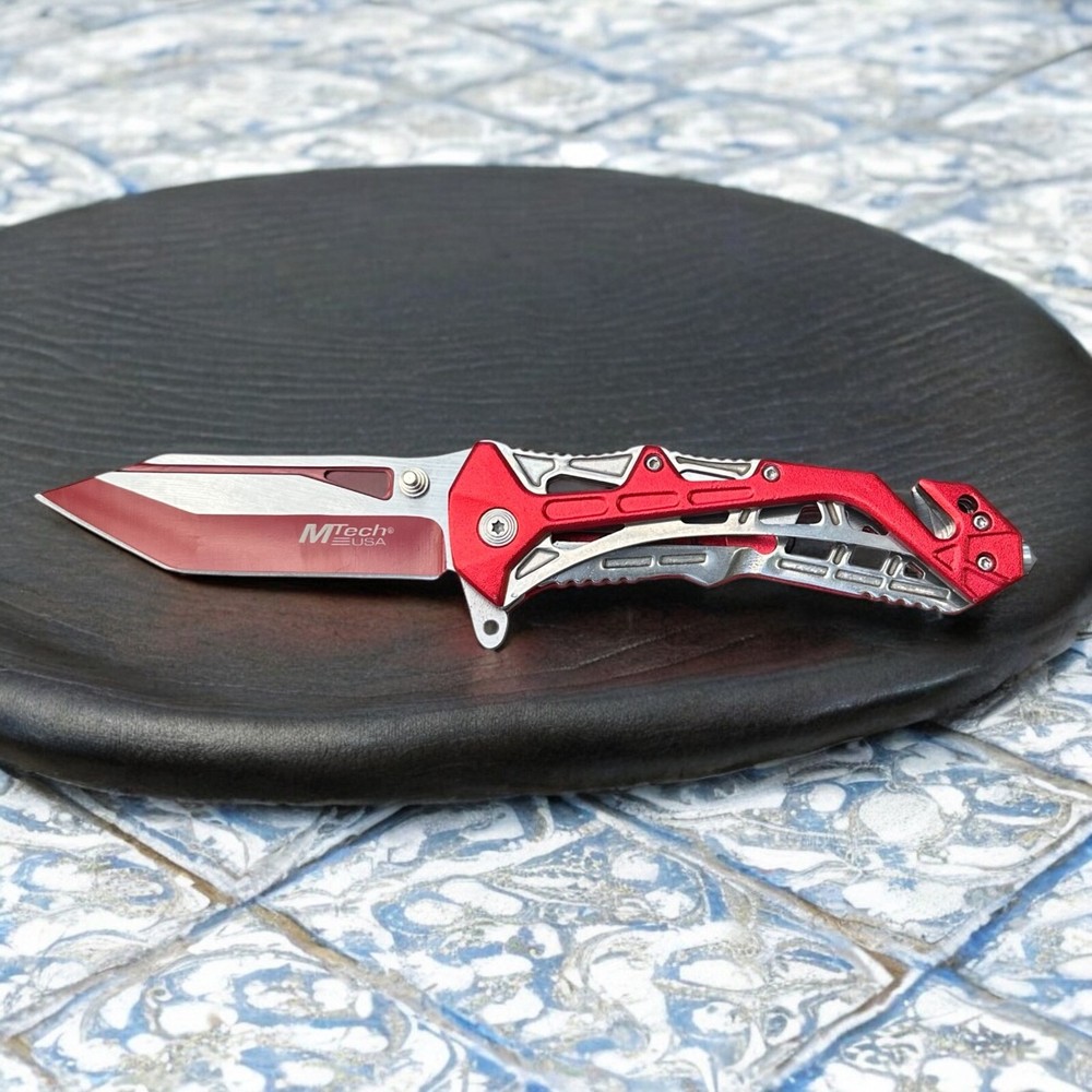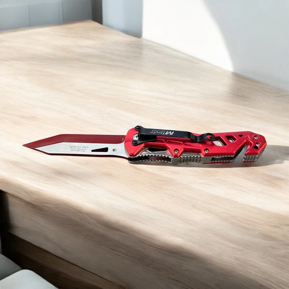 Turn heads while staying prepared with this striking MTech USA folding knife . Built for performance and designed with flair, this bold red and silver blade is the perfect mix of tactical function and standout style. πͺ Blade Style: Two-tone tanto blade β designed for piercing and precise slicing with a rugged look π§· Deployment: Smooth one-handed open with thumb stud and flipper tab π οΈ Built-in Features: Glass breaker tip for emergencies Seatbelt cutter for rescue applications ποΈ Handle: Lightweight skeletal frame with red anodized aluminum overlays β strong, grippy, and futuristic π Pocket Clip: Convenient deep-carry clip for easy transport Whether you're a first responder, outdoor adventurer, or knife collector, this MTech tactical folder is built to perform and built to impress. π¦ Ships brand new and securely packaged π A great gift for EDC enthusiasts, tactical gear fans, or anyone who appreciates a bold knife design Note: Buyer must be 18 years or older. Always follow local knife laws when purchasing.