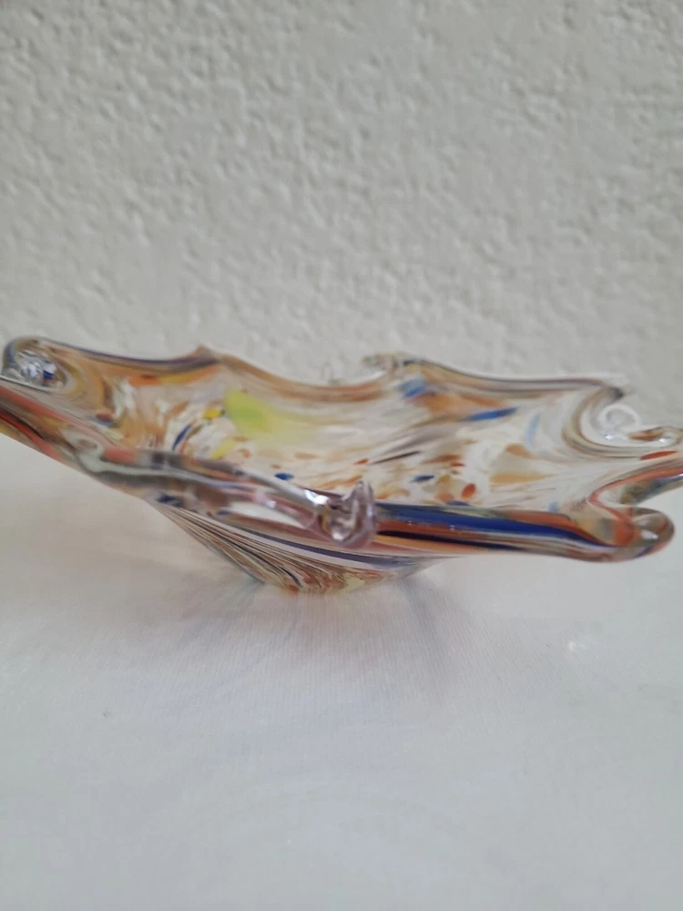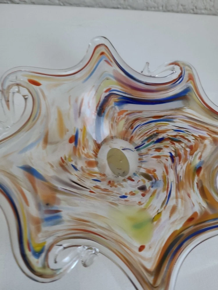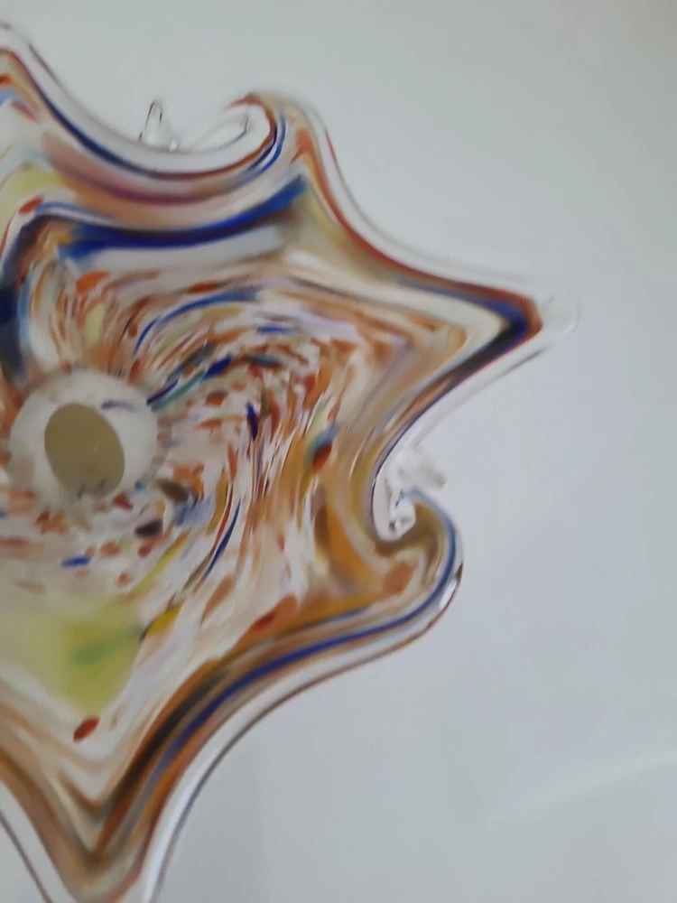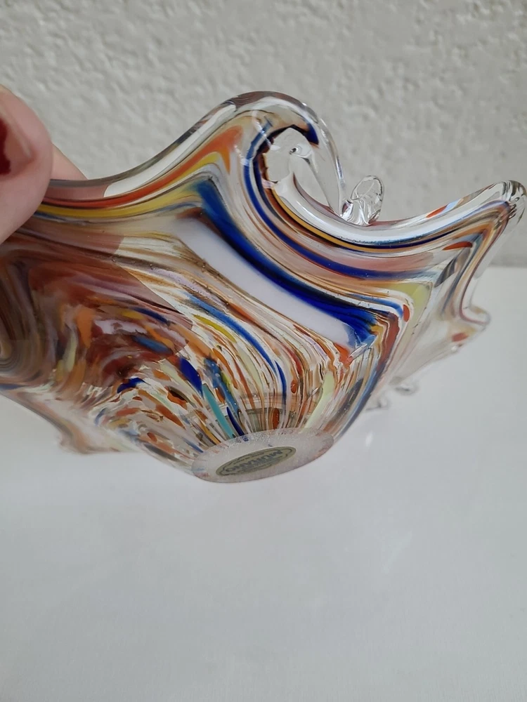 This Murano hand blown glass vase is a stunning piece of art glass. Made in Italy, the vase showcases intricate multicolor designs that are a hallmark of Murano glassmaking. It has been signed by the artist and is a vintage piece, adding to its uniqueness. The vase measures 9 inches and would make a great addition to any collection of decorative pottery and glassware.