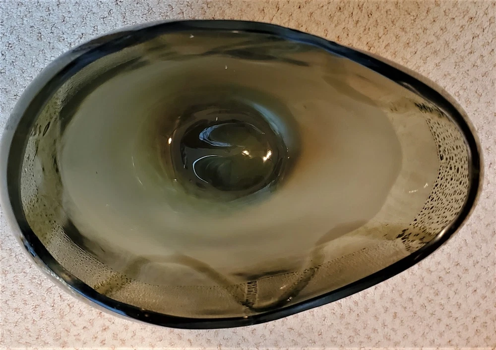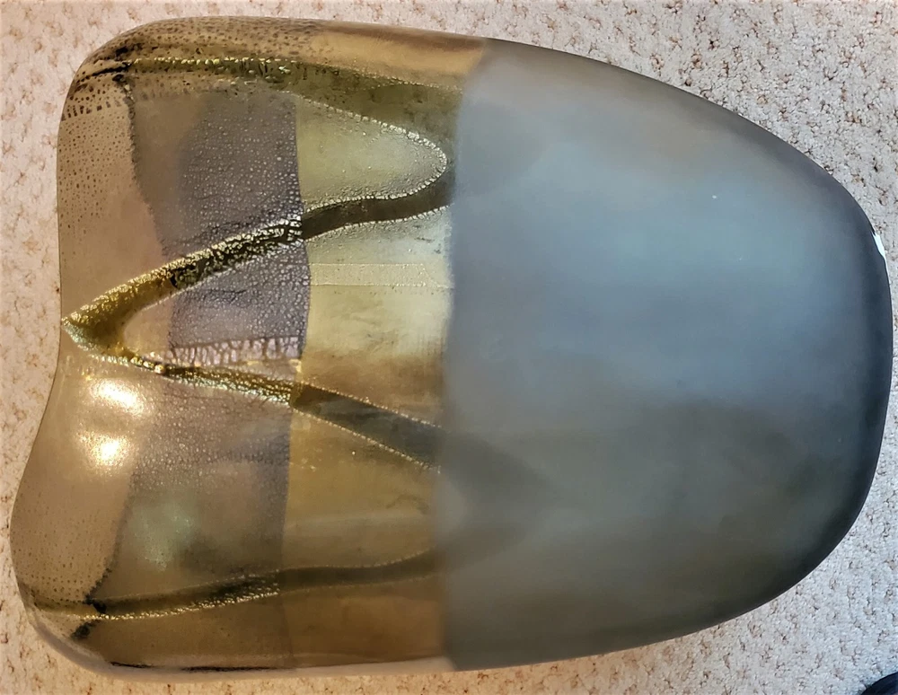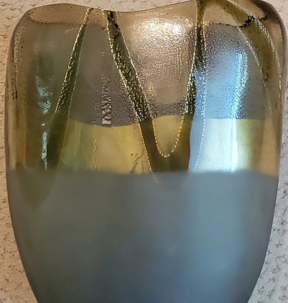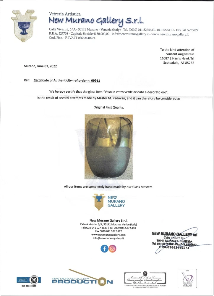 MURANO Orig inal First Quality. "Vaso in vetro verde acid ato e decorato Oro", Vase in green etched glass and decorated with Gold A beautiful vase I purchased in May 2013 at Murano Venice Certificate Of Authenticity ref. order n. 099 n ATTACHED 2022 Appraisal Euro 2000 We hereby certify that the glass item "Vaso in vetro verde acidato e decorato Oro", is the result Of several attempts made by Master M. Padovan, and it can therefore be considered as Original First Quality. 13 Inches Tall and Top Opening 6 ½ X 9 Inches All our items are completely hand made by Our Glass Masters. NEW MURANO GALLERY New Murano Gallery S.r.l.