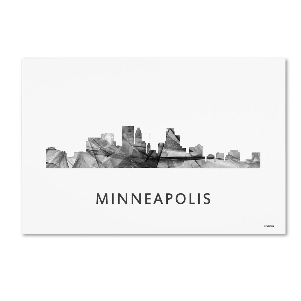 This ready to hang, gallery-wrapped art piece features a black and white designed silhouette of the Minneapolis, Minnesota skyline. Born in Scotland and now residing in Hong Kong, Marlene Watson has been painting her way through life. She paints things she notices in everyday life and brings out her positive energy through her work. Marlene has gallery showings and has also illustrated a children's book. She cares for 12 cats and works toward animal conservation and rescues with her art. Giclee (jee-clay) is an advanced printmaking process for creating high quality fine art reproductions. The attainable excellence that giclee printmaking affords makes the reproduction virtually indistinguishable from the original piece. The result is wide acceptance of giclee by galleries, museums, and private collectors. Gallery wrap is a method of stretching an artist's canvas so that the canvas wraps around the sides and is secured a , wooden frame. This method of stretching and preparing a canvas allows for a frameless presentation of the finished painting. Artist: Marlene Watson Subject: Landscapes Style: Contemporary Product Type: Gallery-Wrapped canvas art Made in USA
