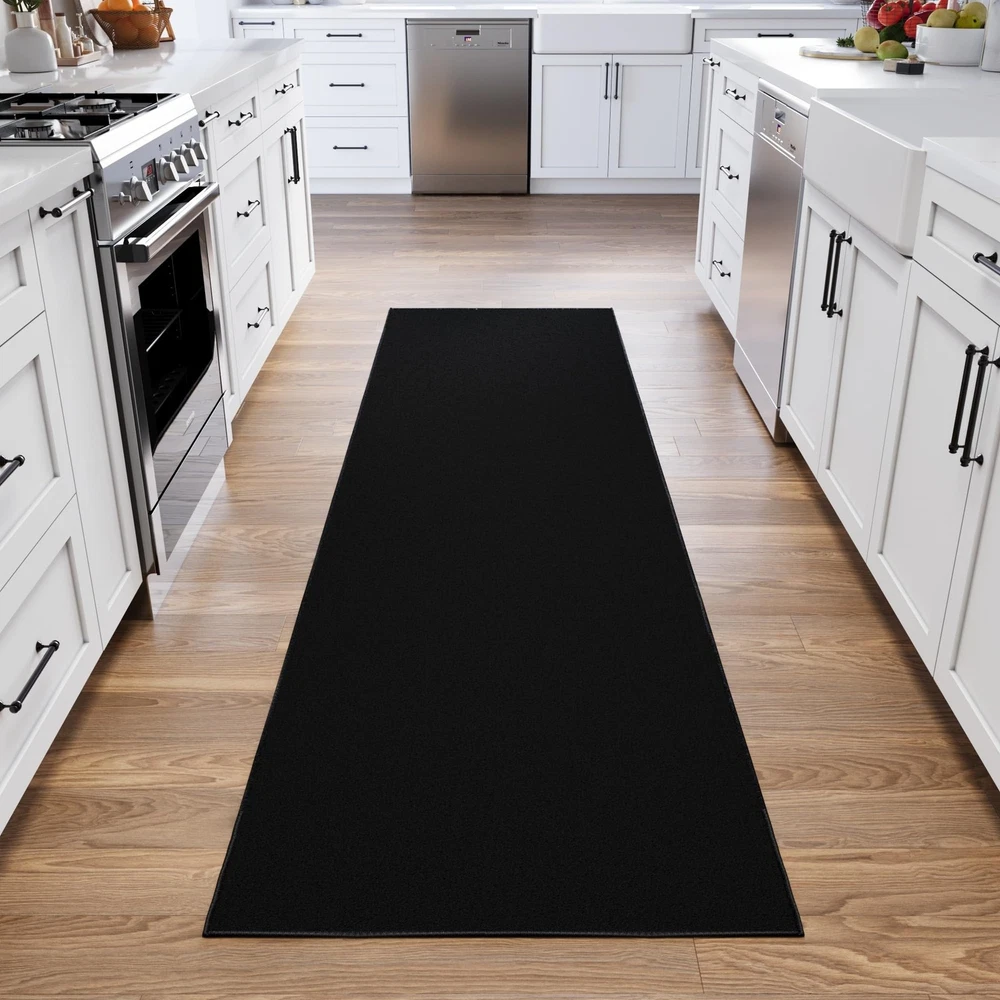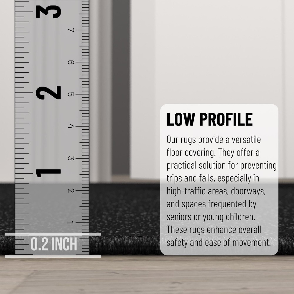 [Non-Slip Backing for Hard Floors]: Rubber backing helps keep the rug in place on tile, hardwood, or laminate—ideal for homes with kids, pets, or busy foot traffic. [Slim 0.2-Inch Profile Clears Doors]: Low-pile construction allows for smooth door clearance and easy furniture placement—perfect for hallways, kitchens, and transitional spaces. [Durable Nylon Built for Daily Traffic]: Tightly woven nylon fibers hold their shape and color over time—stands up to everyday wear in active households. [Stain-Resistant and Easy to Maintain]: Designed to handle life’s messes—vacuum regularly or spot clean for a rug that stays looking fresh. [Simple Solid Colors That Blend In]: Available in versatile neutrals and bold tones like black, red, beige, and navy—easy to match with any room décor or flooring.