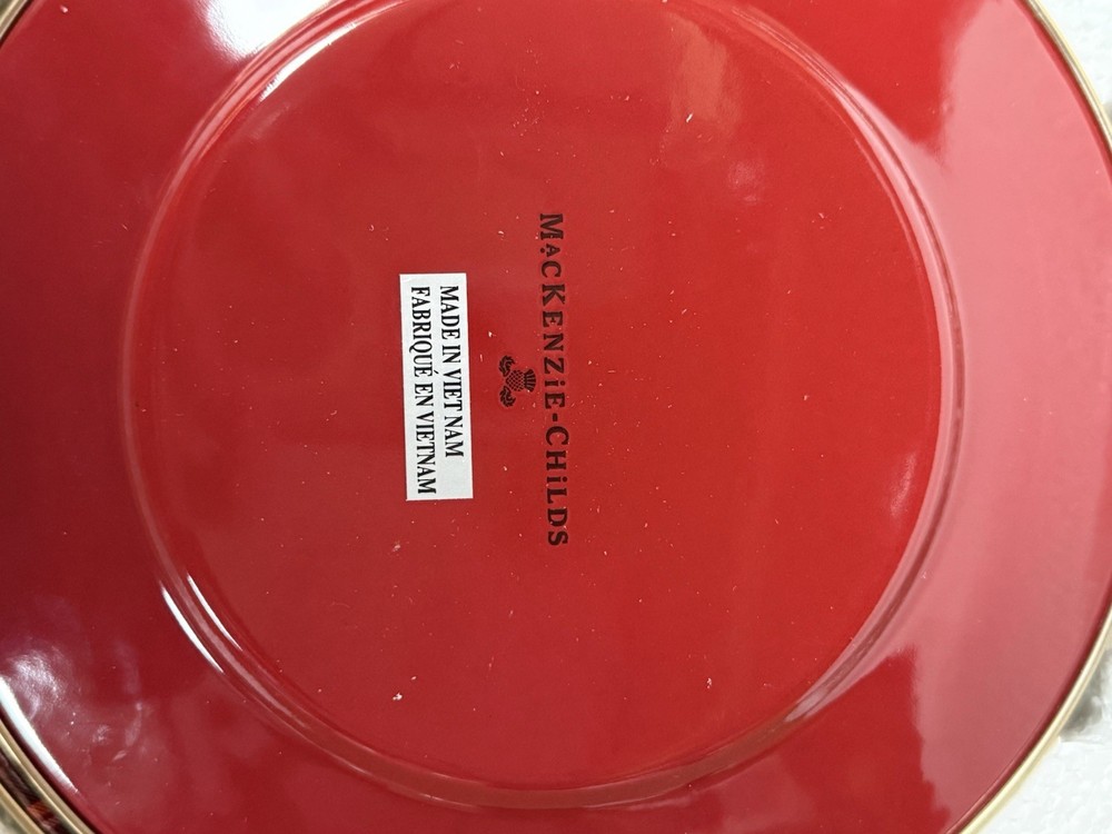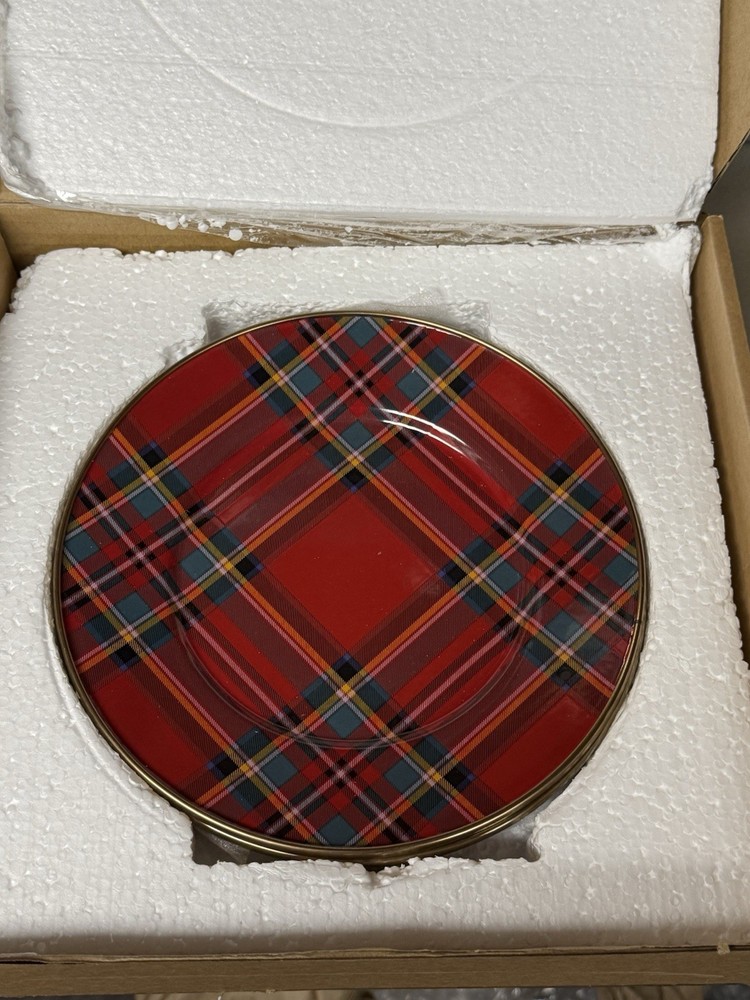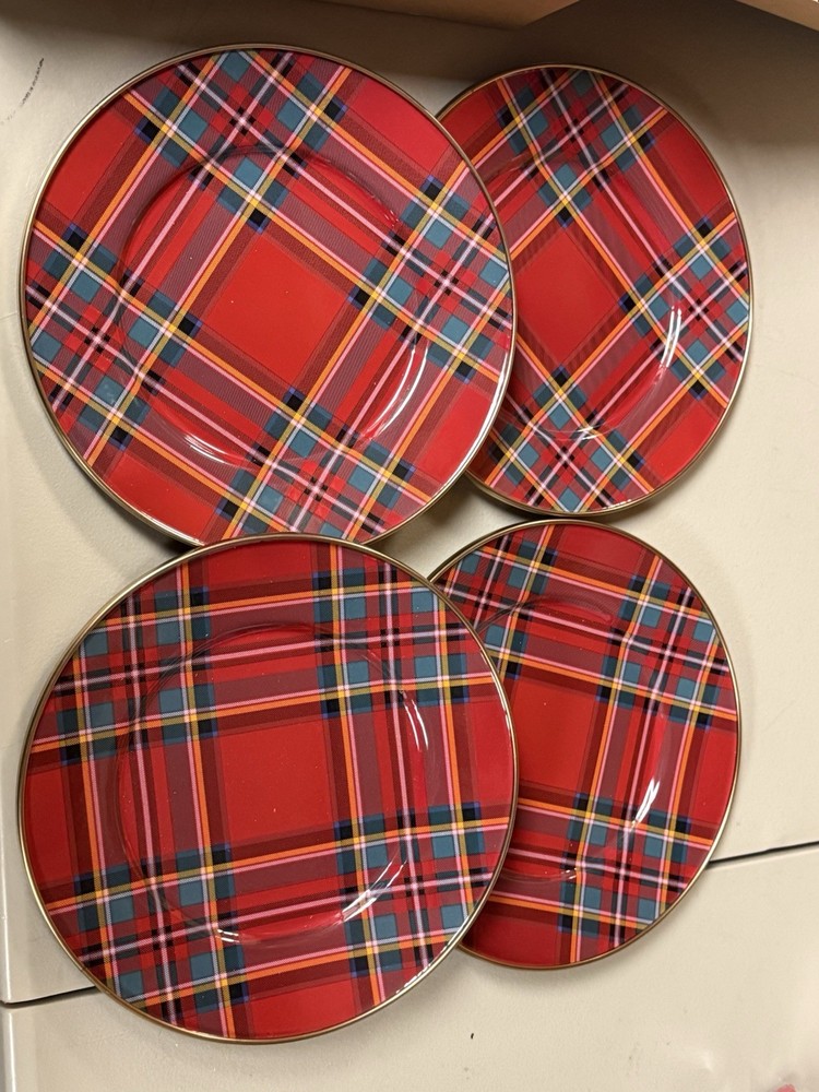 The product is a set of four 8-inch salad/dessert plates from MacKenzie-Childs, featuring a red tartan pattern in enamel. These multicolored plates are perfect for serving salads or desserts, adding a stylish touch to any table setting. The high-quality material ensures durability and long-lasting use, making them a practical and decorative addition to your kitchen or dining room. Includes four salad plates Check pattern Enamel with glossy finish MacKenzie-Childs home decor is hand-crafted, meaning each item is either hand-painted or includes hand-applied decals Each measures approximately 8"Diam Hand wash; do not microwave Imported Item will be shipped either UPS - USPS or FedEx