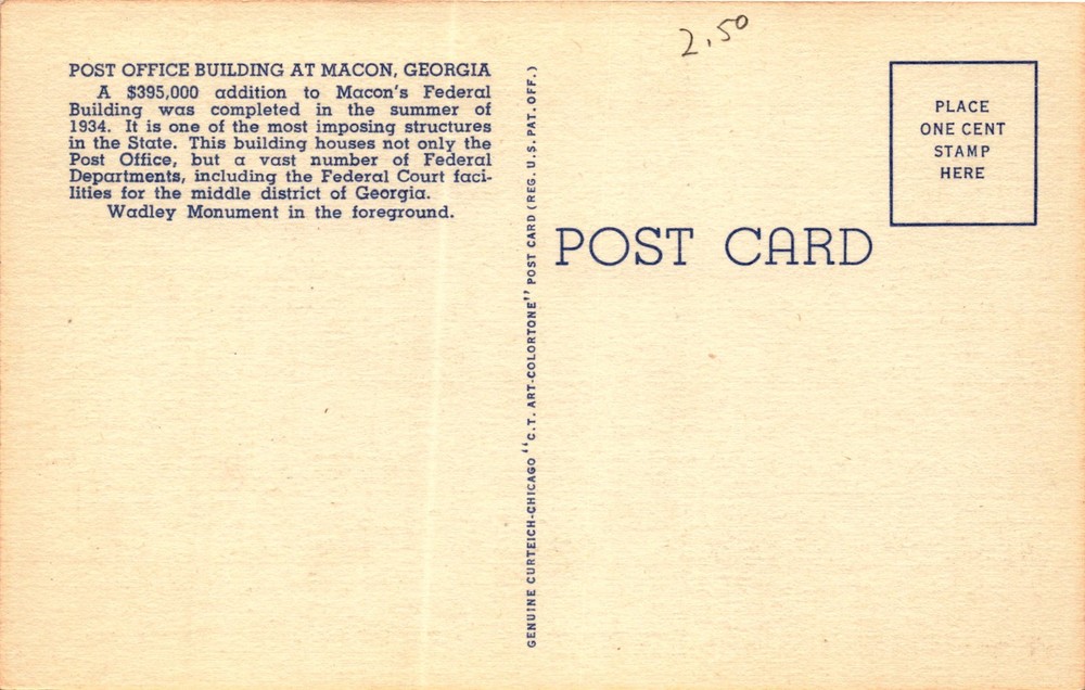 The postcard features an image of the Post Office Building in Macon, Georgia, which underwent a $395,000 addition in 1934. This building is a significant structure in the state, housing not only the Post Office but also various federal departments, including the Federal Court facilities for the middle district of Georgia.