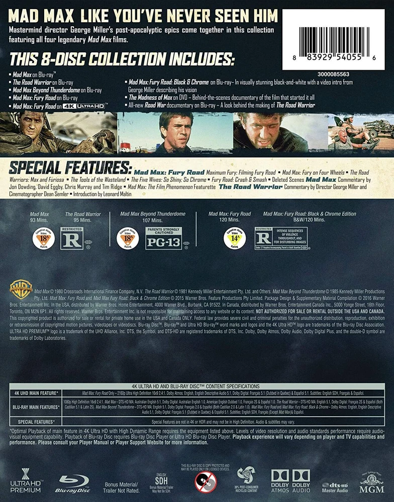 Further Details Title: Mad Max High Octane Collection Condition: New Description: * All four groundbreaking films – Mad Max, The Road Warrior, Mad Max Beyond, Thunderdome, and Mad Max: Fury Road – from visionary director George Miller. * Mad Max: Fury Road – Black & Chrome Edition – See the winner of six Academy Awards in a mind- blowing new black-and-white edition. * Introduction by George Miller on the Black & Chrome Edition and his original vision for Mad Max: Fury Road. * Mad Max: Fury Road on 4K Ultra High Definition Blu-ray. * Over three hours of new and rarely seen documentaries on the Mad Max movies, including the new Road War documentary on Mad Max 2: The Road Warrior. * Includes Mad Max: Fury Road on UV. Format: Blu-ray Director: Various Actor: Various No Of Discs: 8 Release Date: 12/06/2016 Studio: WarnerBrothers Language: English EAN: 0883929540556 Region Code: Blu-ray: A (Americas, Southeast Asia...) Release Year: 2016 Missing Information? Please contact us if any details are missing and where possible we will add the information to our listing.
