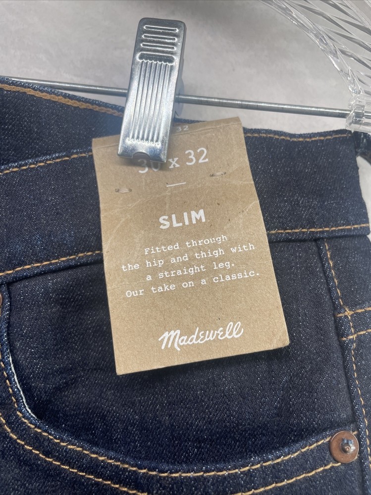 Elevate your denim game with these Madewell by J. Crew Men's Slim Denim Jeans. The dark wash cotton blend fabric exudes a classic American style that never goes out of fashion. The selvage fabric type adds a touch of sophistication to the jeans, making it a perfect fit for any occasion. Featuring a mid-rise waist and straight leg style, these jeans are slimming and comfortable. The zip closure provides a secure fit, and the 32-inch inseam ensures it fits perfectly on a size 30 waist. These jeans are perfect for any fashion-forward man who wants to make a statement with his style.
