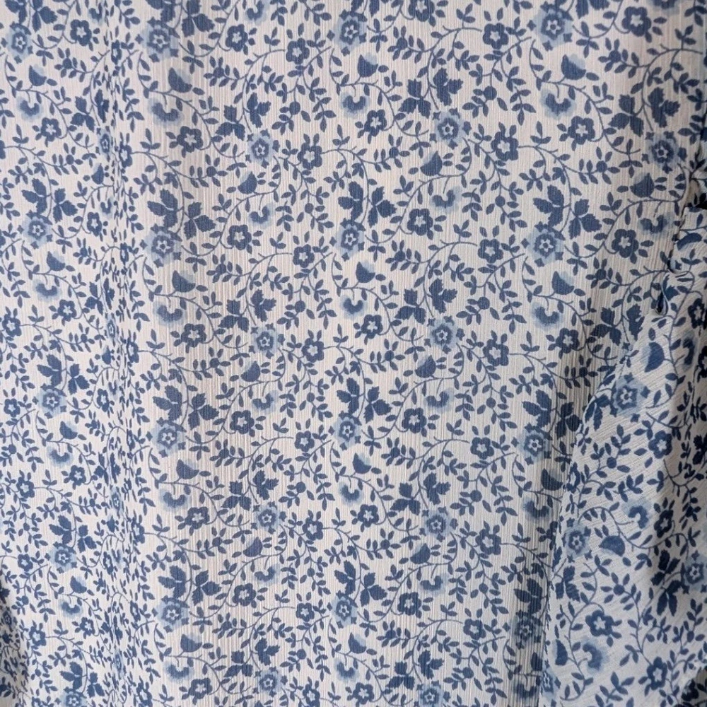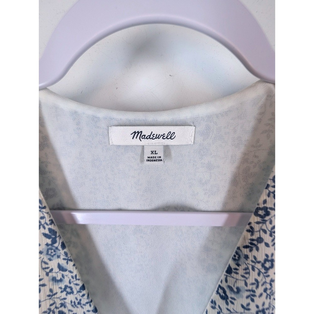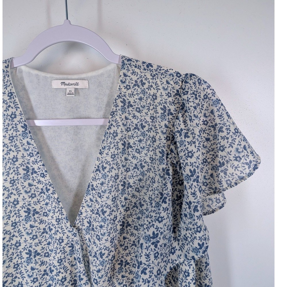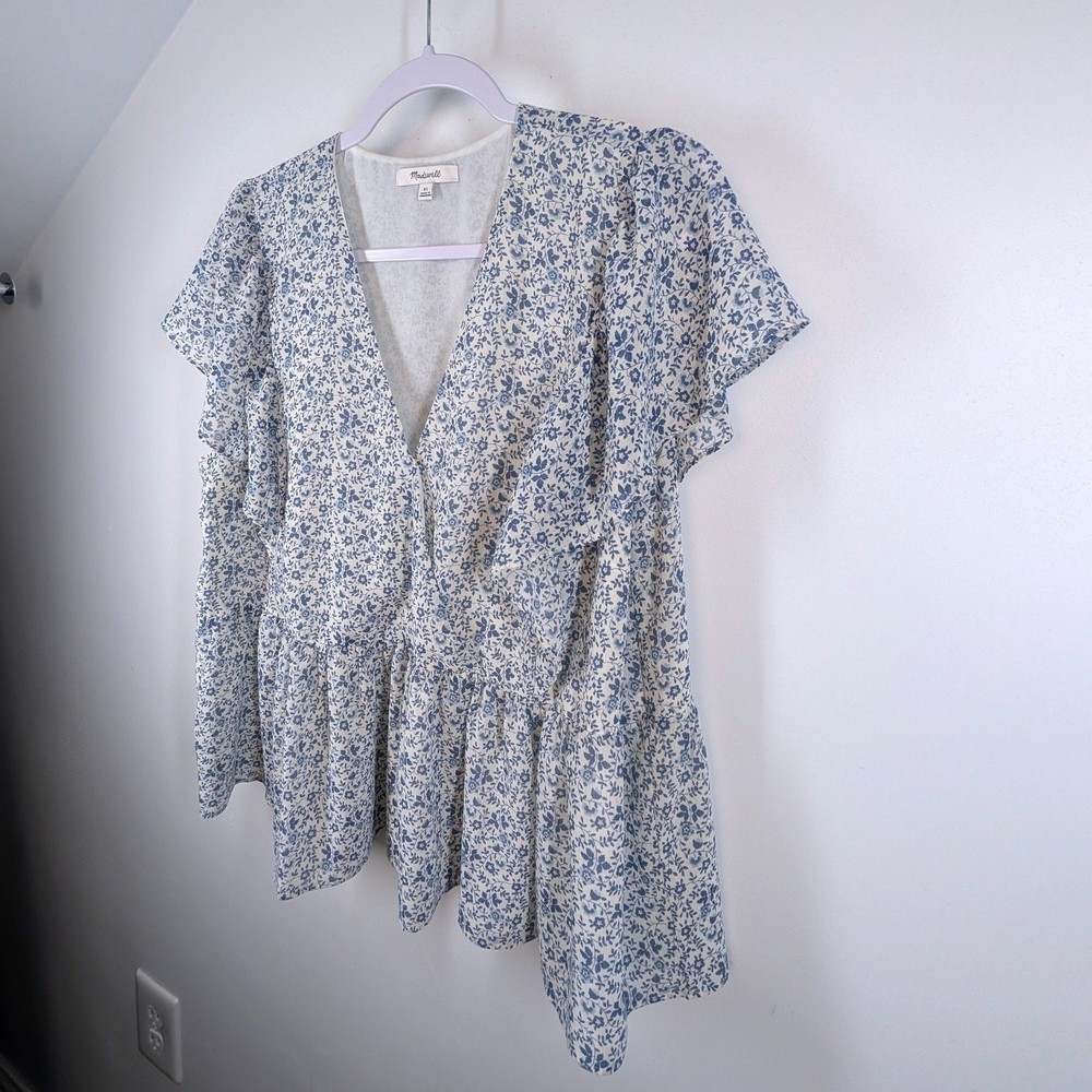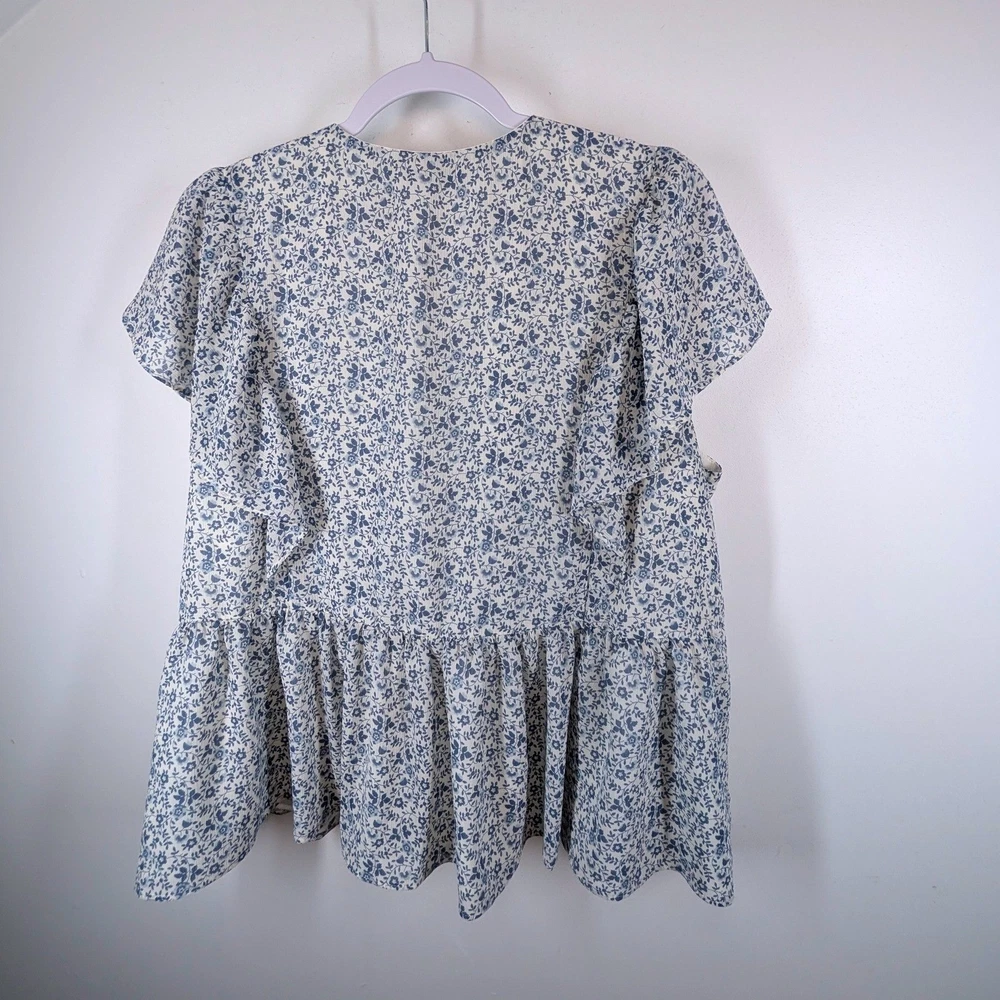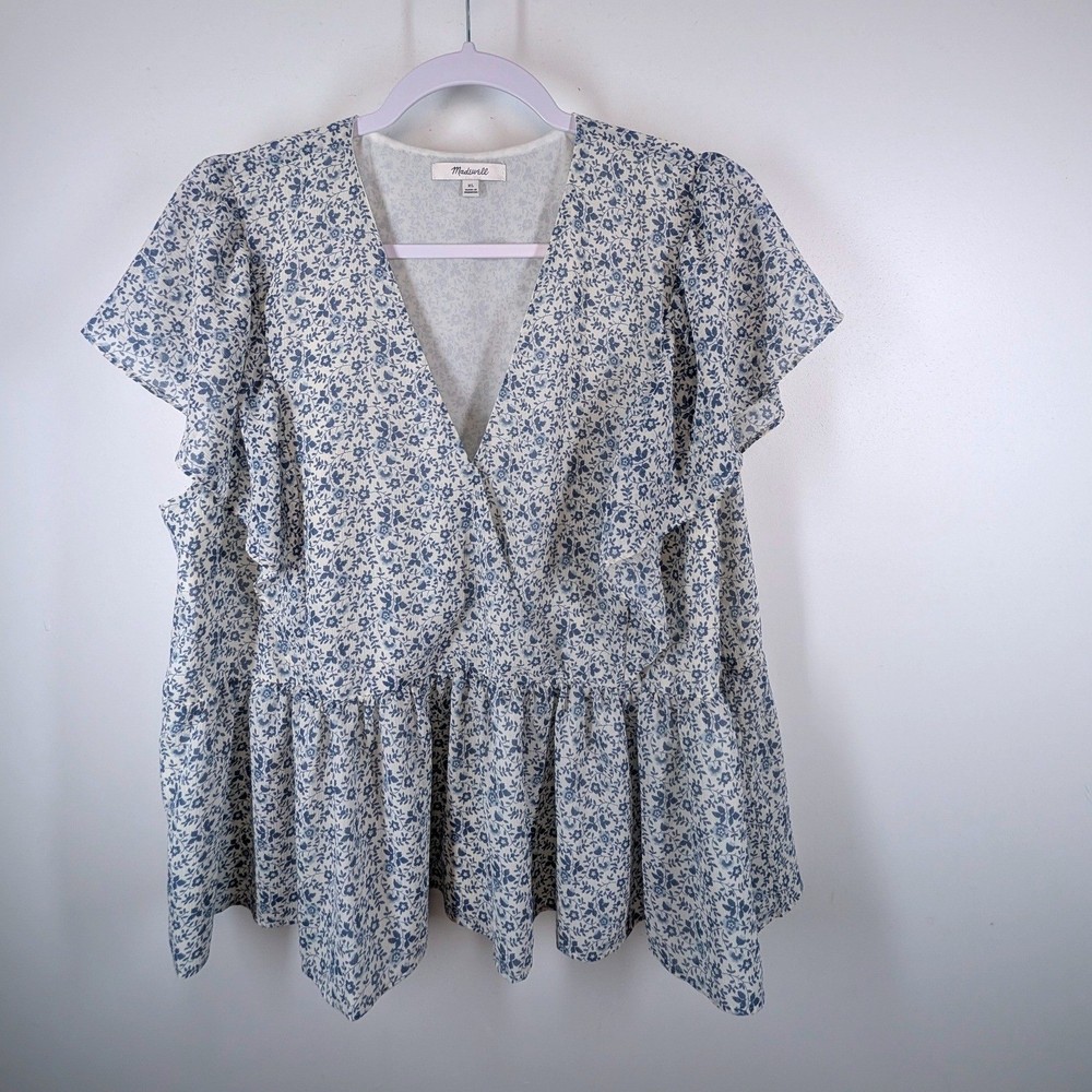 Madewell wrap peplum top in a charming blue floral print. This stylish piece features a flattering V-neckline, delicate flutter sleeves, and a tiered peplum hem that creates a beautiful silhouette. Perfect for a casual brunch, a day out shopping, or a relaxed evening with friends. Type: Blouse Department: Women Neckline: V-Neck Sleeve Length: Short Sleeve Sleeve Type: Flutter Sleeve Pattern: Floral Accents: Ruffle Theme: Nature, Flower Features: Lightweight Fit: Regular Fabric Type: Woven Occasion: Casual, Party/Cocktail Closure: Pullover Season: Summer, Spring Keywords: Madewell, wrap top, peplum, floral print, blue floral, flutter sleeve, v neck, women's, casual, brunch outfit, daytime, feminine, lightweight Save on shipping and bundle!