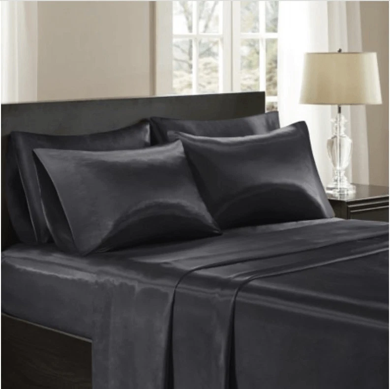Madison Park Essentials Satin King 6pc Sheet Set in Black - Olliix SHET20-174 These silky high luster satin sheets are luxurious on any bed all year round. It has naturally wrinkle free properties and are machine washable. Fits up to a 16 inch. Store stock Buttons on the packaging does not snap properly. It is missing one button closure. Packaging is a little ripped on one of the edges Dust and sticker residual noted There is no damage to the sheet set Dimensions: 1 flat sheet:108" W x 102" L, 4 king pillowcases: 20" W x 40" L, 1 fitted sheet:78" W x 80" L x 14" D Luxurious silky satin sheets Wrinkle free and durable Fitted sheet fits up to 16-inch on the mattress depth Set includes 1 flat sheet, 1 fitted sheet, and 4 pillowcases Conveniently machine washable Machine washable Imported
