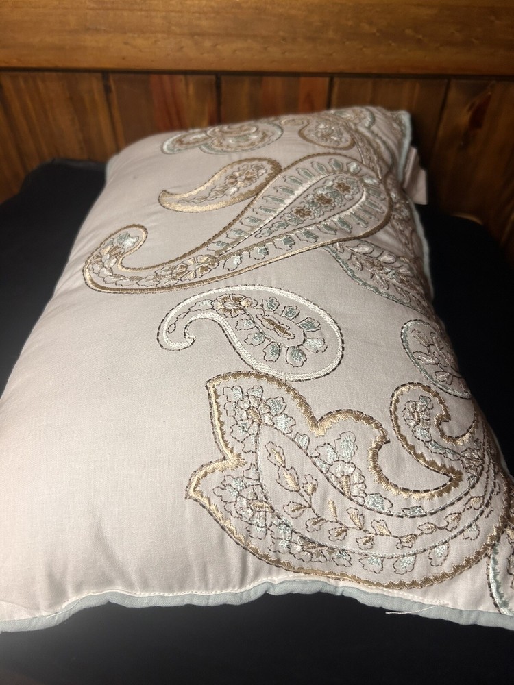 The Madison Park Pure Paisley Design Pillow features a white background with a stunning paisley pattern in shades of blue and gold. Measuring 17 inches by 11 inches, this decorative pillow is a stylish addition to any home decor. Perfect for adding a touch of sophistication and elegance to a living room or bedroom, this pillow is designed to enhance the aesthetic appeal of the space.