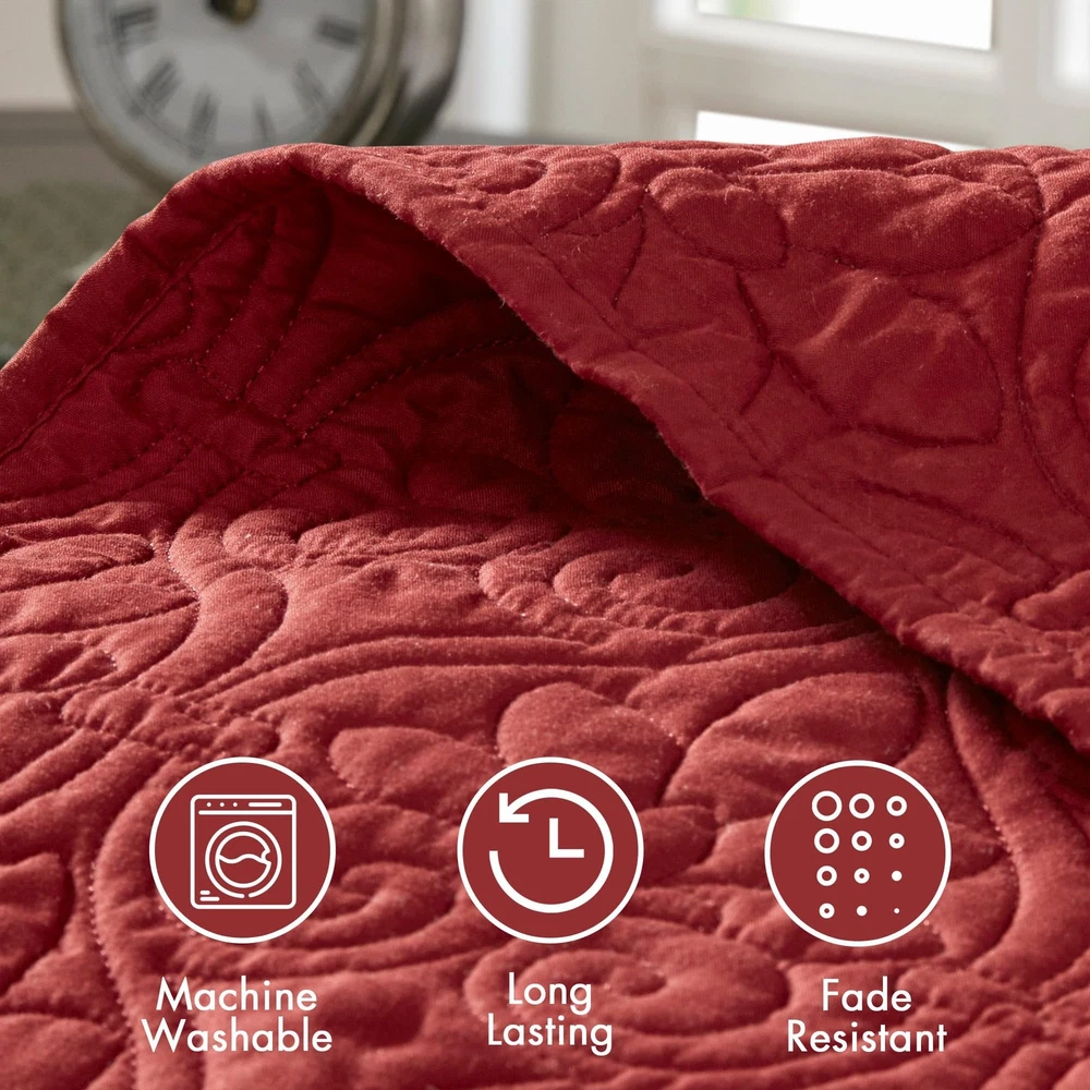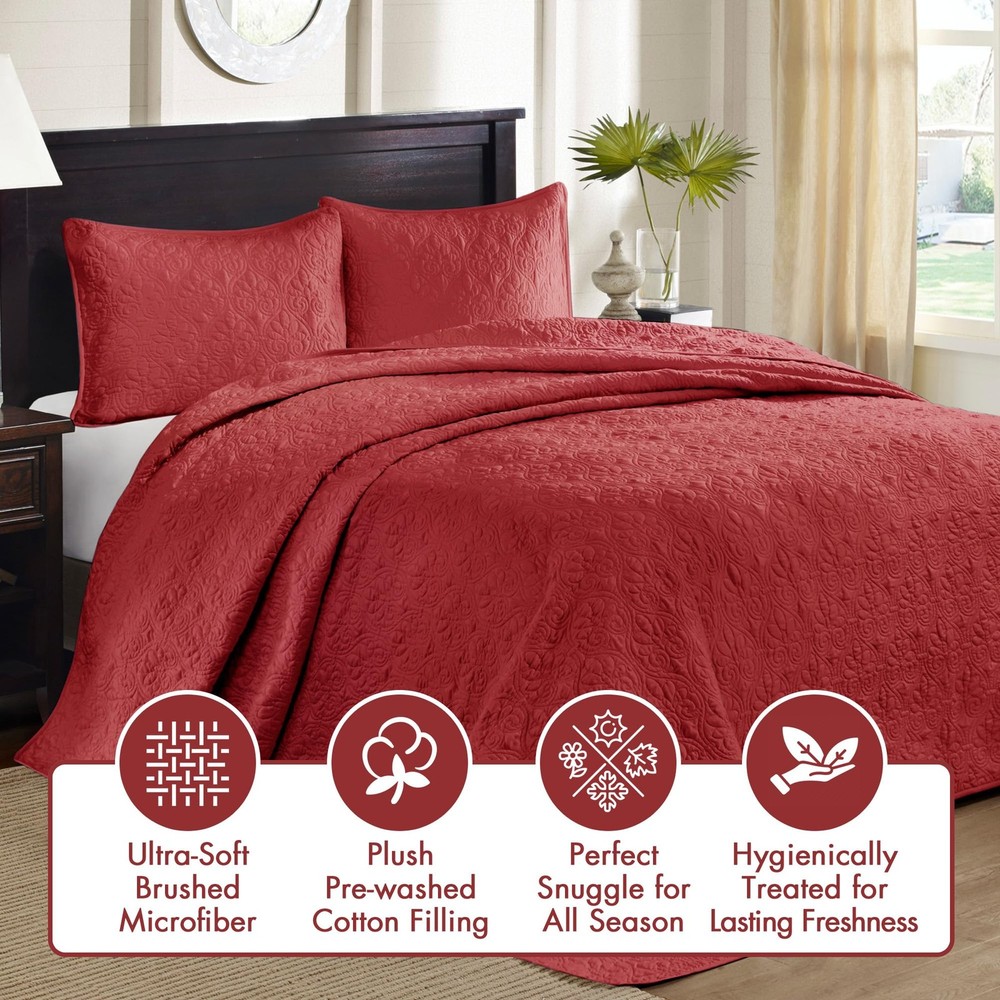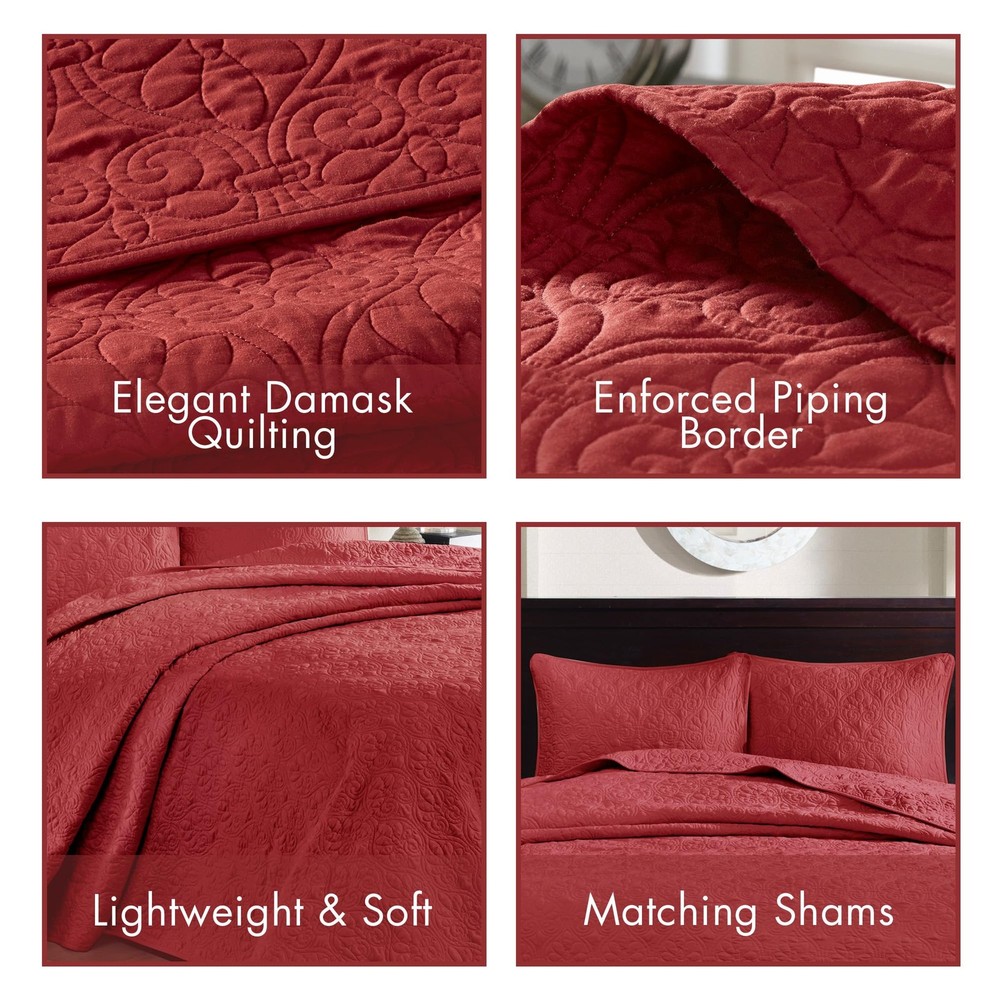 This quilt set is absolutely stunning! The rich red damask pattern adds a luxurious touch to my bedroom, and the quality is impressive—soft yet durable. The 3-piece set fits my queen bed perfectly, and the design is even more beautiful in person. Highly recommend for anyone looking to elevate their bedroom decor effortlessly!