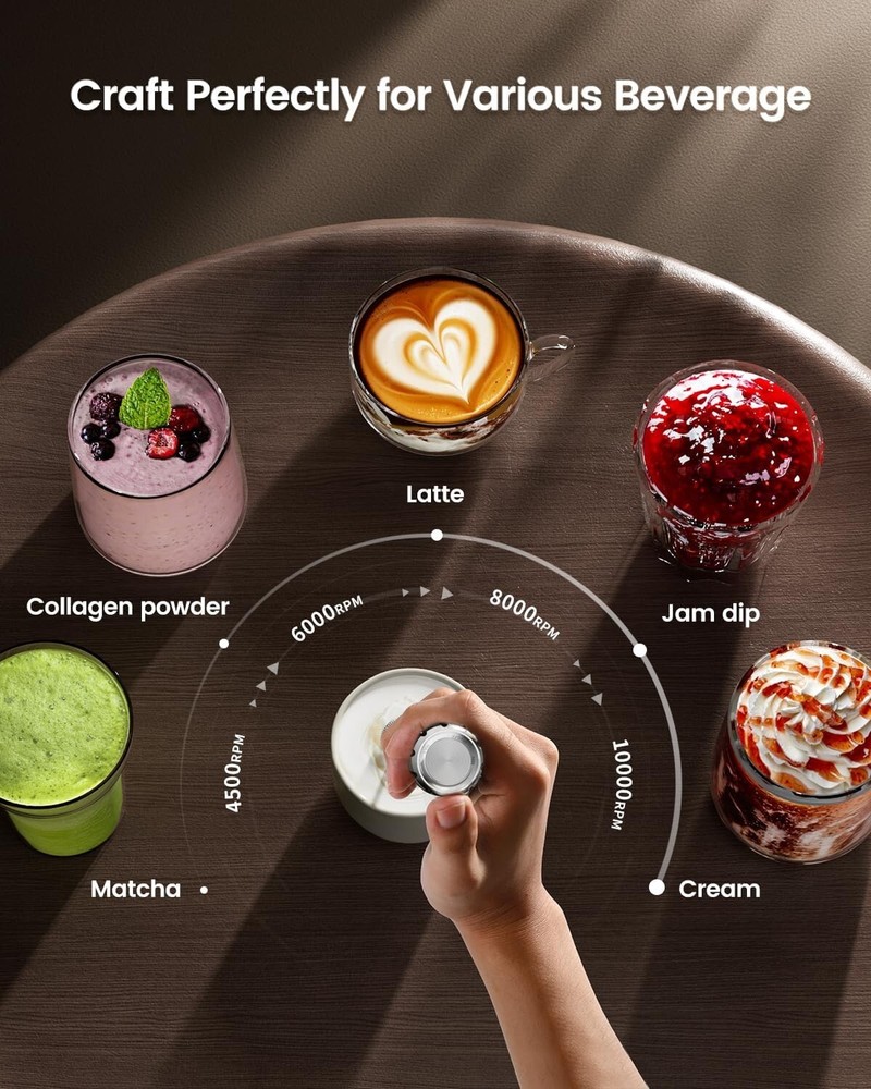 Foam Maker Waterproof Drink Mixer Foamer with Stainless Steel Stand & Detachable Whisks for Lattes, Cappuccino Brand Maestri House Special Feature Stepless Speed Control, Adjustable Speed Control, Lightweight, Rechargeable, Compact Design Color Black Material Stainless Steel, Aluminum Alloy Recommended Uses For Product Residential About this item 【World First & Game-changer in Frothing】 Experience the world's first Stepless Speed Control handheld milk frother! Easily adjust the rotary dial for perfect froth and tailored drinks. Precision meets versatility in your hands. Redefine your beverage game now! 【Stepless Speed Control Design】Unlike traditional button-operated milk frother, this electric milk frother allows you to seamlessly adjust the frothing speed with unparalleled precision, ranging from 4500RPM to 10000RPM, simply by toggling the rotary switch. Experience the ultimate control as you craft the perfect froth for different beverages. Say goodbye to splashes and lackluster froth. 【One Charging, 3 Months of Power】With a built-in 2000mAh lithium battery, this portable USB-C rechargeable milk frother provides up to 3 months of usage on a single charge. Fully charge the battery operated milk foam maker in just 3 hours with the included USB-C cable, eliminating the need for constant battery replacements. 【Create Rich Creamy Foam in Seconds】Transform your morning coffee routine with our high-speed milk frother. Achieve smooth, creamy foam in just 10-15 seconds, perfect for busy mornings. Elevate your coffee experience with velvety milk foam every time. 【Versatile for Various Beverages】 Beyond coffee, our milk frother excels at blending powdered supplements like protein into beverages and preparing mixed drinks. Its versatility makes it an essential tool for all your beverage-making needs, including Latte, Cappuccino, Matcha and cocoa powder. 【Easy Cleaning and Storage】This Stepless Speed Control milk frother comes with two frothing whisks for easy replacement. Cleaning is straightforward—simply detach the whisk and wash it in water. The included compact stainless steel stand provides convenient storage and organization. 【Sleek and Durable Aluminum Alloy Body】Crafted from a sleek, all-metal aluminum alloy, our handheld milk frother combines style with durability. Its lightweight, portable design allows you to create frothy lattes, velvety matcha, rich cappuccinos, and indulgent hot chocolates anywhere.
