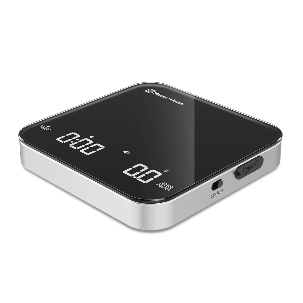 Rechargeable Mini Coffee Scale with Timer, Maestri House Black&Silver Product Details Product Dimensions : 4.13 x 4.13 x 0.78 inches; 11.64 ounces Item model number : K112 Batteries : 1 C batteries required. (included) Manufacturer : Maestri House Country of Origin : China Brand: Maestri House Color: Black&Silver Recommended Uses For Product: Outdoor, Adults, Coffee, Indoor, Food Special Feature: Portable, Lightweight, Auto Shut Off, Rechargeable, Tare Function Display Type: LED 【Ultra Small, Yet Professional】The Espresso Scale is small enough to fit in your palm. It measures 4.13*4.13*0.78 inches and weighs just 0.75 pounds. The coffee scale can work on most espresso machines and small pour-over coffee stands. It's easy to store and carry around, making it perfect for coffee lovers who like outdoor coffee. 【Three Units & Dual Timekeeping Modes】The Espresso Digital Timer Scale has three units of measurement (g/oz/ml) that can be converted at any time. The small coffee scale has two built-in timing modes, automatic and manual, allowing you to accurately time the coffee brewing process. This feature ensures that your coffee is always delicious and perfectly brewed to your taste. 【Long Standby Rechargeable Battery 】The gram scale has a built-in 500 mAh lithium battery and a USB-C charging cable in the package. There is no need to replace or buy batteries; they can be used for up to 90 days on a single charge. The coffee scale will automatically enter sleep mode after 5 minutes of inactivity to save power. 【Elegant Design & Premium Materials】Maestri House Digital Coffee Scale features a sleek, minimalist design with borosilicate glass surface. It adds elegance to your kitchen, seamlessly blending with your decor. With a hidden LED display and touch-sensitive controls, its seamless surface enhances aesthetics and ensures waterproof, easy cleaning. It includes a detachable silicone pad for surface protection, offering waterproof, slip-resistant, scratch-resistant, and heat-insulating properties. 【Silent Brewing】Experience a tranquil coffee morning with our coffee scale's Mute Function. Press and hold the TIMER and ZERO buttons for approximately 2 seconds to deactivate the beeping sound, allowing you to enjoy a peaceful start to your day.