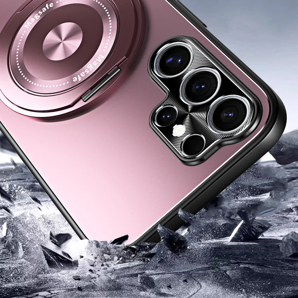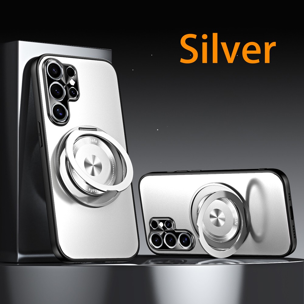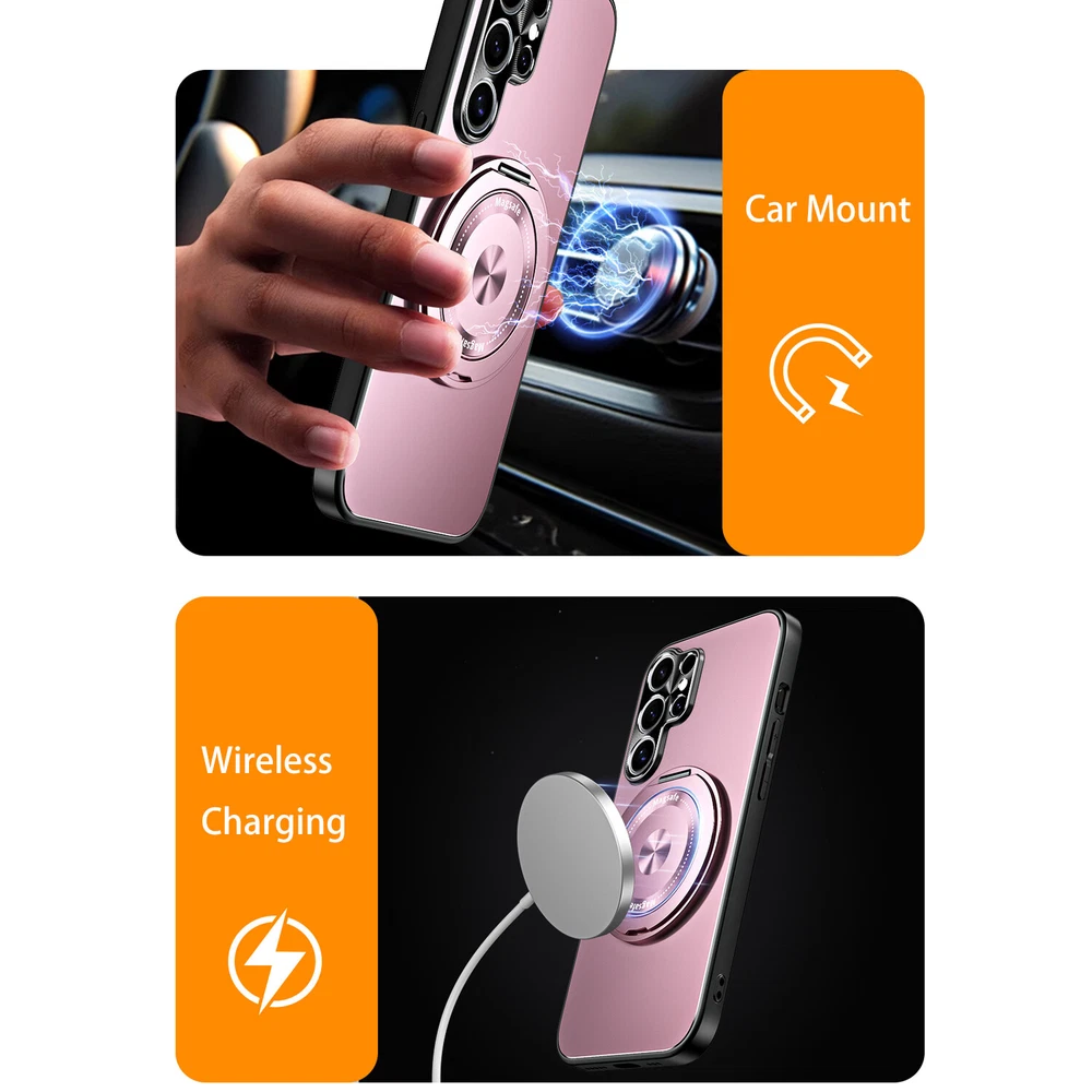 Mag Safe Magnetic Case For Samsung Galaxy S24 S23 Ultra Plating Ring Stand Cover Product Features: MagSafe Compatibility & Magnetic Car Mount Support: this hybrid rugged case supports MagSafe charging and is compatible with magnetic car mounts, ensuring convenience and versatility. PC + TPU Frosted Plating Design: Crafted with a frosted PC and TPU construction, this case offers a sleek yet rugged look while providing reliable protection against drops, impacts, and scratches. 360° Rotatable Ring Stand: Equipped with a 360° rotatable ring stand, this case enables hands-free viewing and can double as a secure grip for enhanced usability and portability. Lens All-Inclusive Protection: The all-inclusive lens protection design safeguards your camera from scratches and daily wear, ensuring crystal-clear photo quality at all times. Shockproof Rugged Build: Built with durable materials, this case absorbs shocks and impacts to keep your phone protected while maintaining a lightweight and slim profile.
