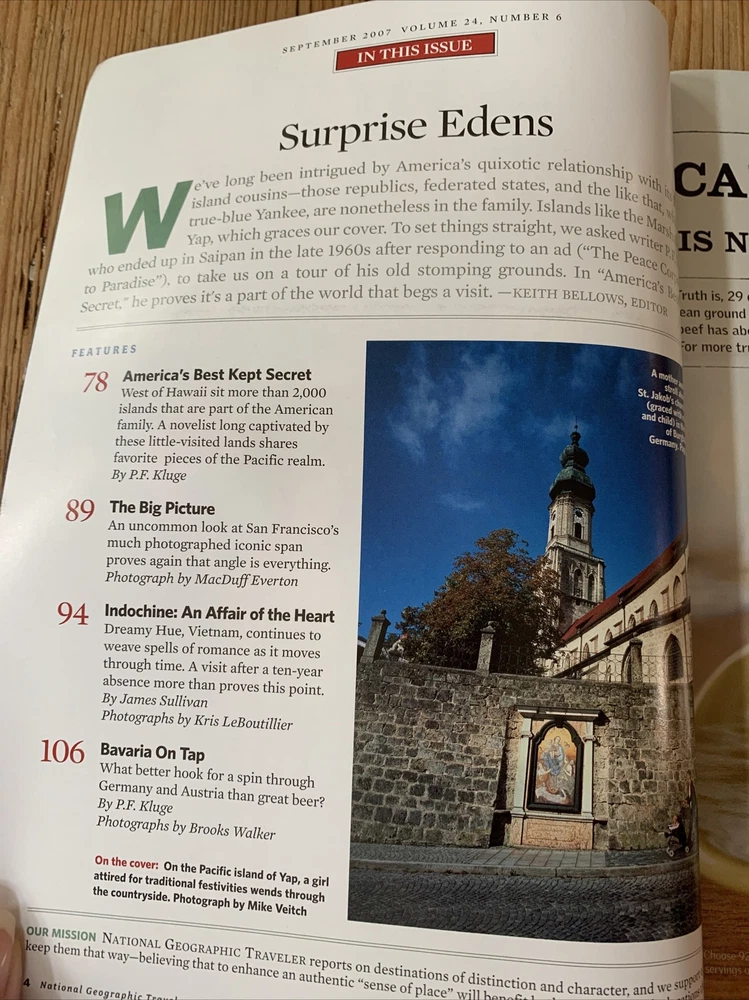 MAGAZINE TITLE : National Geographic Traveler Pacific Retreats - America's Best Kept Secret Tokyo uncovered How to rent a villa A Drive though Bavaria Love in Vietnam Walking Boston FORMAT : Magazine PUBLICATION DATE : September 2007 CONDITION : BRAND NEW! Never read - been sitting on a shelf. PAYMENT : Payment is due within 3 days of the end of the auction. SHIPPING : Shipping is via US Post Office ONLY. RETURN POLICY : I list items to the best of my ability and try to describe each item as best as possible. Items that were grossly missrepresented may be returned for a refund of bid price only (I will not refund any postage). Refunds will be issued once I receive the item back. Please check out my other items - I will gladly combine shipping! Email me if you have any questions.