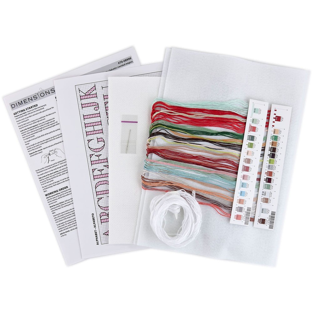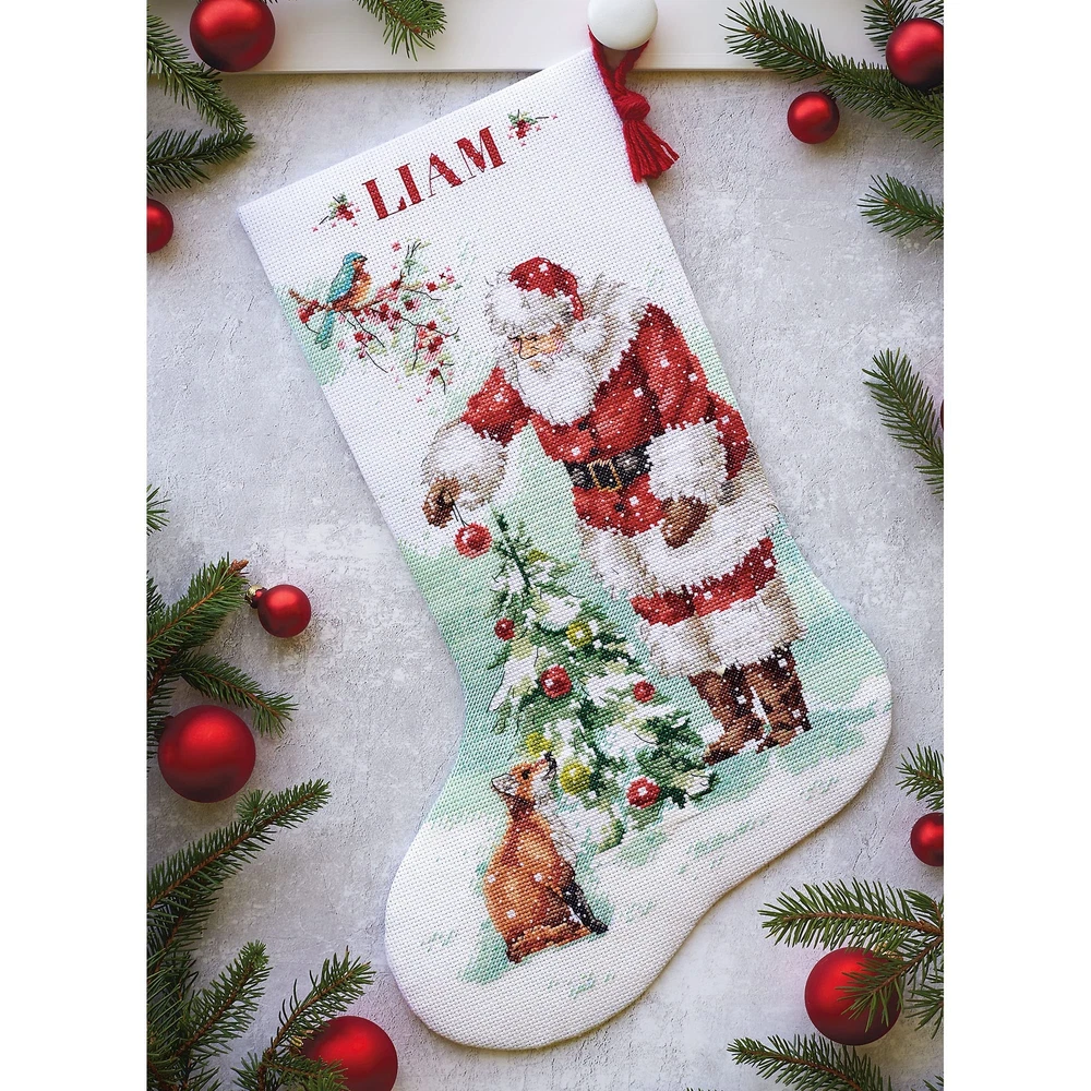 Santa has come to help the forest folk decorate in this counted cross stitch stocking kit. The traditional look of this counted cross stitch design is sure to evoke that happy holiday feeling - the perfect Christmas craft activity for the long winter break. Finished size: 16" long, and kit contains presorted thread, 14 count white Aida, felt for stocking back, 100% wool yarn for stocking hanger, needle, and instructions with an alphabet for personalizing. Original artwork copyright of Lisa Audit, licensed by Wild Apple. cross stitch stocking kit contains presorted thread, 14 count white Aida, felt for stocking back, 100% wool yarn for stocking hanger, needle, and instructions with an alphabet for personalizing Completed Christmas cross stitch pattern measures 16" long This traditional Christmas cross stitch stocking pattern features Santa helping his woodland friends with all of their festive Christmas decorating Easy-to-instructions include a chart and key, detailed stitch diagrams, a guide on how to finish as a stocking (stocking finishing materials not included), and the package features a large color image of the design for reference while you stitch This cross stitch stocking pattern is a fun, festive way to celebrate new family members and pets, and can also be gifted to crafters as a thoughtful and festive Christmas present