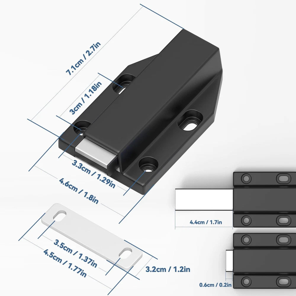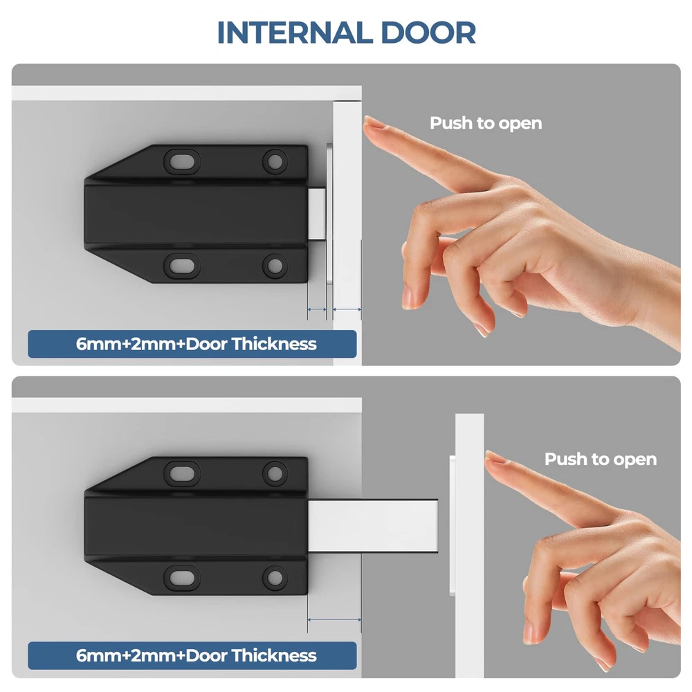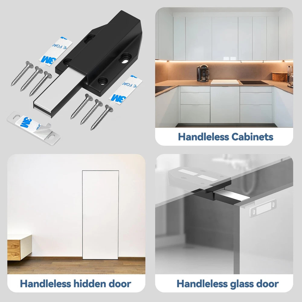 Push to Open: Suitable for using with hinges without self-closing feature.Built-in spring-loaded plunger, you can just simply press the door to latch or unlatch. Eliminates the need for handles or knobs. Create the clean, seamless look of no knobs. Secure Locking: Push latch opener features a bigger and thicker magnet that brings stronger magnetic force to make the door close tighter. The magnetic force can reach 25 pounds, so you don't have to worry about the door not closing anymore. Suitable for kitchen cabinets, drawers, cupboards, closets, and dressers, it also works on invisible doors up to 125kg. More Durable and Long-lasting: High quality nylon housing, Larger and thicker heavy-duty spring mechanism has a strong enough tension make this push opener an exceptionally durable and timeless choice. Ensure lifetime up to 20000 times. Easy to Install: double-sided adhesive installation: You can install the ultra-slim strike without drilling screw holes by using the included adhesive. Don't worry about 3M adhesive peeling off over time. Attention: Please wipe the dust and oil stains on the cabinet surface clean before using 3M adhesive. (Please note: the included adhesive comes in red and white colors and will be shipped randomly). Screw installation: install two oval holes to determine the position, then install two round holes to fix the position. Then align the bouncer with the base latch. last fix the plate with screw or adhesive at the inside of cabinet door. What You Get: 2 x Push to open door catches;2 x metal plates;12 x Base Mounting Screws; 6 x Ultra thin Adhesive strike(Warm Tip: For external door, 3mm compression stroke must be reserved during installation.) Gift for Decoration: You can also give it as a gift to a friend who is recently renovated at home.If you have any question, please feel free to contact us, we will help you.