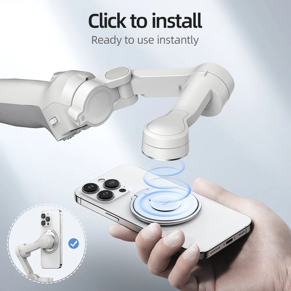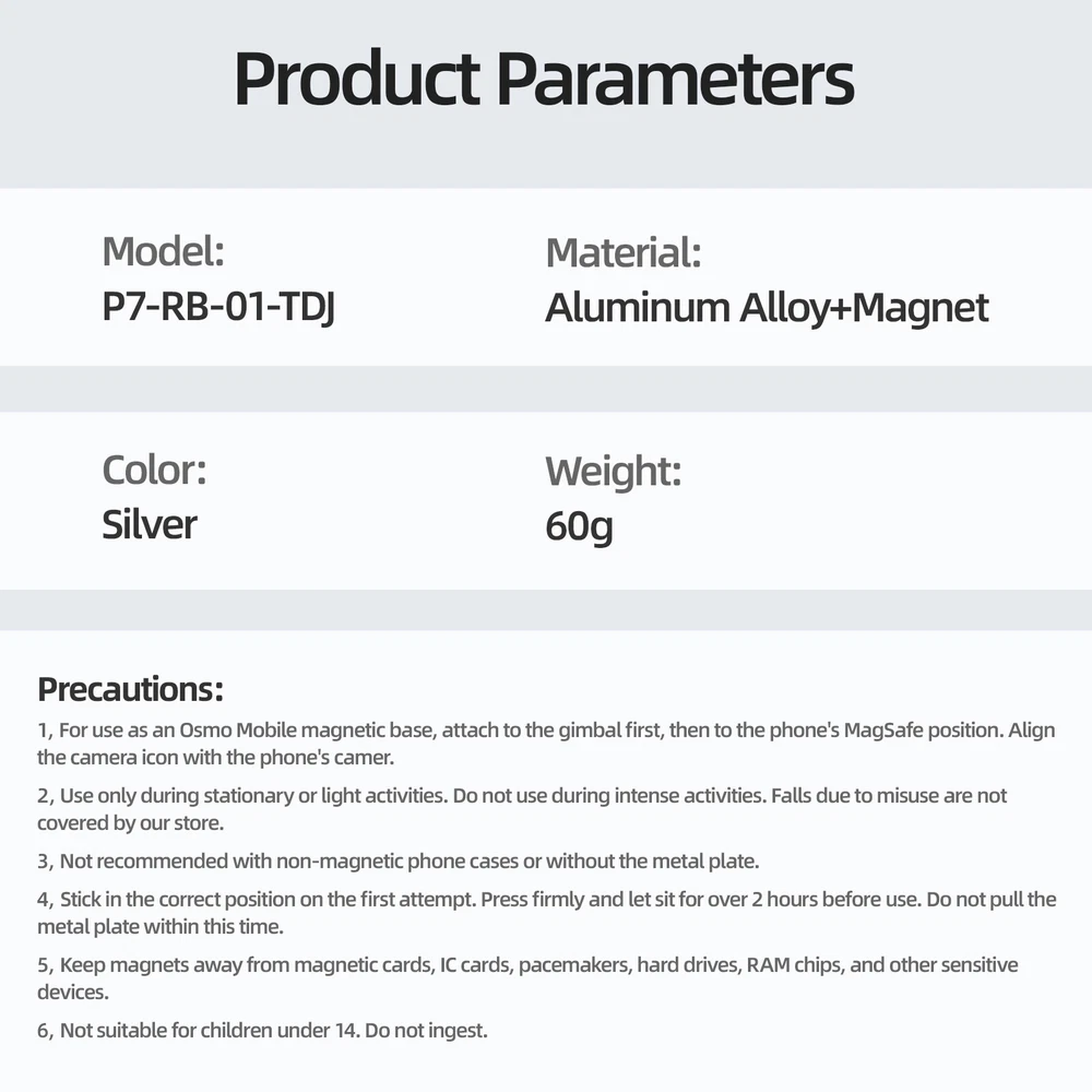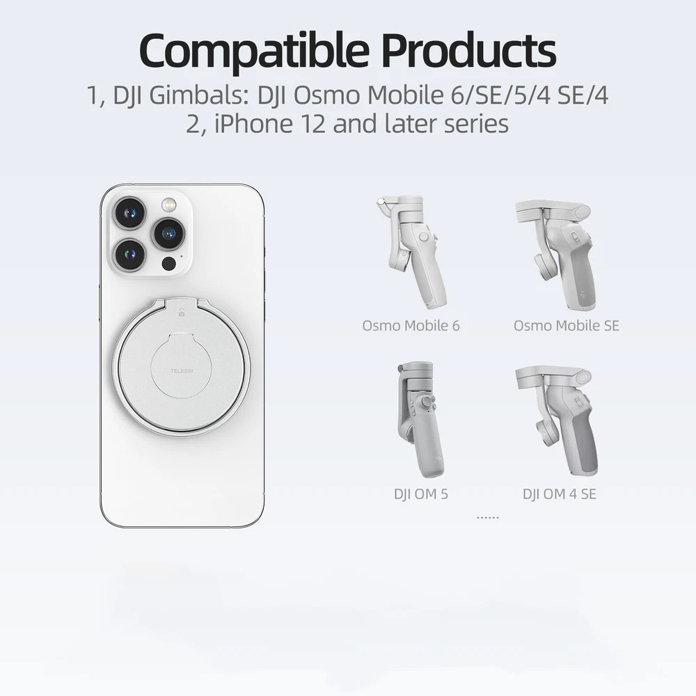 SAFE & SECURE SHOPPING 100% SATISFACTION GUARANTEED FAST SHIPPING Magnetic Ring Holder Clamp/Adapter Mount For DJI Osmo Mobile 6/OM 5/OM 4/OM 4 SE Product Description Description: 100% brand new Name: MagSafe Magnetic Adaptor Material: aluminium alloy + magnet Colour: silver Size: 7.9*7.7*2cm For DJI Osmo Mobile 6/ OM 5/ OM 4/ OM 4 SE For Magsafe iPhone Android Smartphone Features: 1.Suction finger ring holder, super strong magnet, solid adsorption, double-sided magnetic design, close fit without falling off, can be adsorbed DJI Osmo series mobile phone gimbal. 2.Snap-on design, accurately match the concave and convex snap-on design, tightly fasten the device, no fear of accidental dislodgement. 3. With a click, the installation is complete, suction with use, efficient and convenient. 4. 360° rotation of the ring, 180° opening and closing structure, both horizontal and vertical colour. 5. Small and exquisite, no sense of carrying, more slim body, does not take up space, travel without burden. 6. Comes with a soft rubber layer, fits more closely, effectively preventing mobile phone scratches. 7. Aluminium alloy CNC processing, anodic oxidation process, feel comfortable to prevent cuts, as new for a long time. List: 1*Magnetic finger ring holder 1*Magnetising sheet 1*Instruction manual 【Precautions】: 1.If you want to use the product as Osmo Mobile magnetic base, attach the product to the Osmo Mobile gimbal first, then attach the other side to the mobile phone Magsafe position. Note that the camera logo on the product and the mobile phone lens facing the same direction. 2. The product needs to be used in static or light exercise, please do not use in intense exercise, fast running and jumping or cycling environment, such as more than the use of the defined scope of the mobile phone drop, the shop will not be responsible for the cost of the machine micro-repair. 3. It is not recommended to use it with the mobile phone case without magnetic suction function and without the magnet. 4. Please make sure to paste the correct position for the first time, and do not paste repeatedly. After pasting, you need to press it until it fits perfectly, and leave it for more than 2 hours. (Don't pull out the magnetic sheet within 2 hours) Payment Shipping Returns Contact US Payment Payment must be completed within 5 days. If you have any problems about payment, please contact us via ebay message. Shipping We only ship to confirmed ebay Order addresses. Please comfirm that your Order address is in line with your shipping address. Please kindly note that the combined shipping is not provided because the shipping fee is calculated by weight. Also, the each additional item means exactly the the same color and size. It takes about 7-15 working days to US; about 10-30 working days to other countries. Transit time may be a little delayed because of the bad weather and customs inspection. If you do not receive your item within 30 working days since payment finished, please contact us immediately for further assistance. Returns Items can be returned for exchange or refund within 30 days from the date you receive your merchandise. We are not responsible for any purchase after this 30-day period. Return shipping is the responsibility of buyer unless the return is a result of our mistake (i.e., your receive the wrong item). We will pay for shipping replacement back to you if an exchange is requested. Contact US Customer satisfaction is very important to us and our feedback rating reflects this satisfaction. If you have any questions, Our customer service staffs welcome feel free to contact us by EBAY message box. We strive to answer all questions and resolve any problems as quickly as possible. Copyright © 2022 Tongtool On Feb 23, 2025 at 23:40:53 PST, seller added the following information: