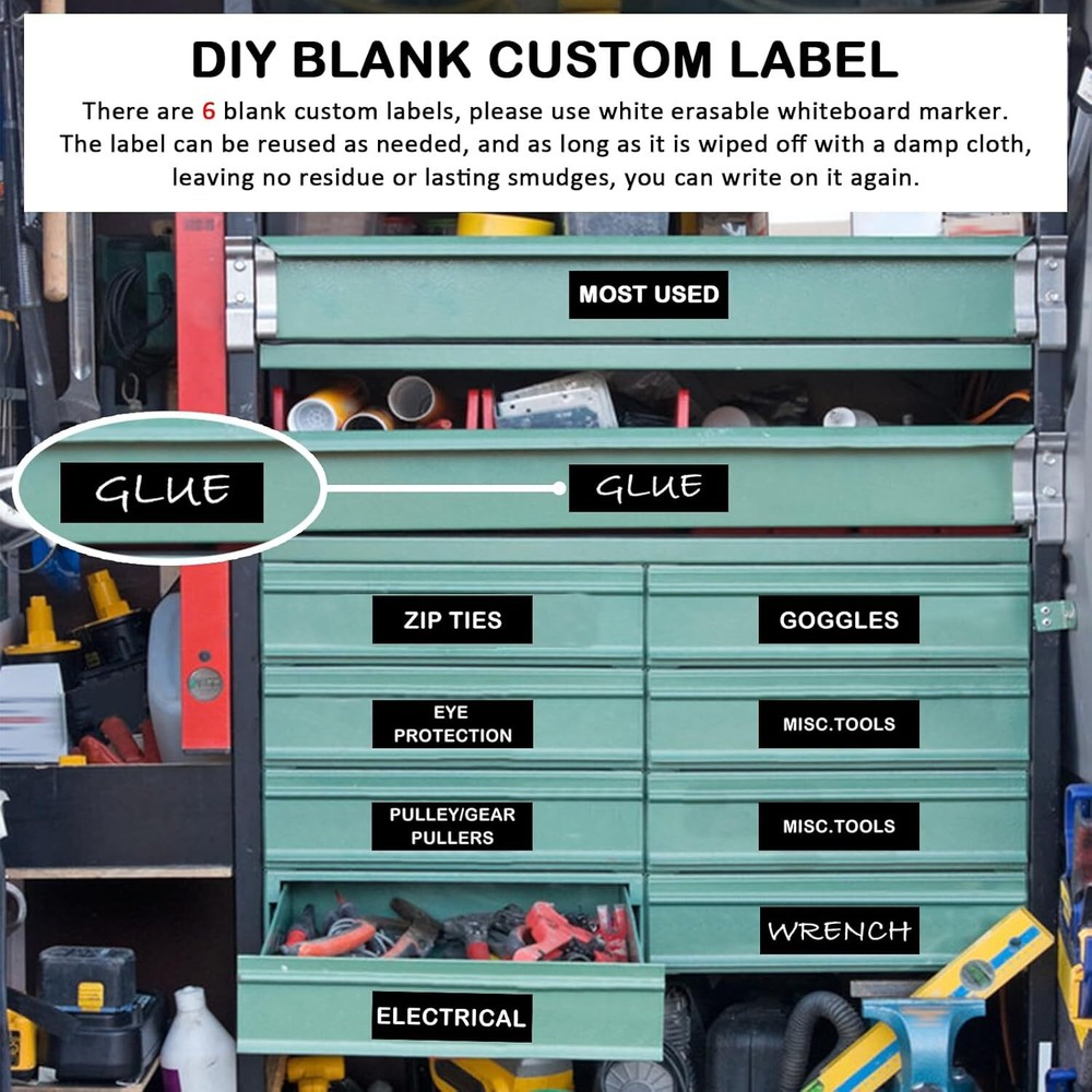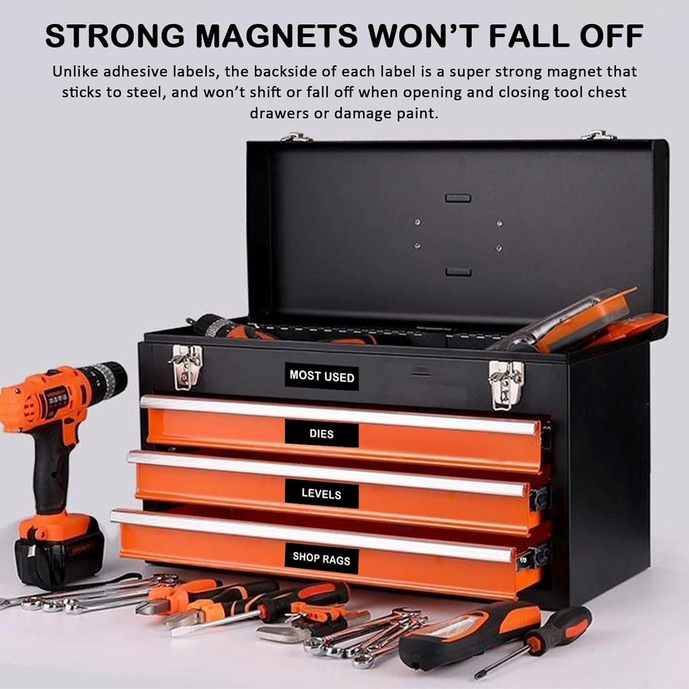 Magnetic tool lable Tool Box Organization Labels with Strong Magnet Easy to Read Tools organization helper: With these magnetic tool labels, not only you can identify you need these tools are in which drawer quickly, but also can make your tool box more tidily. They are stick on the drawers, convenient for people find or put back the tools, saving a lot of search and organization time. Easy to read: Each magnet labels measuring 4 x 1 inches, bigger than other standard labels, design with bold white font printed, making the tool name more eye-catching, easy to read for accurate tool finding. Quality material: Our toolbox magnet labels are made of quality soft rubber magnets, which have strong magnetic, will not fall off when opening or closing tool drawers. Waterproof material, non-fading and are made to last with clearly printed. Reusable labels: All these tool labels are magnetic, can be directly attach to any metal surface such as iron tool boxes or cabinets, magnetic boards, etc. They can stick or remove on your iron toolboxes easily, and without leaving traces. Set included: You will receive 72 black magnetic labels, including 66 labels already printed with tool names and 6 blank labels. Enough quantity to meet your daily learning and work needs. Make your toolbox categories cleaner and neater. Shipping We offer FREE shipping on all orders! We ship within Three business days of payment, usually sooner. Local pickups and combined shipping options are not provided at this time. Return You can return a product for up to 30 days from the date you purchased it. Any product you return must be in the same condition you received it and in the original packaging. Please keep the receipt. Payment We accept payment by any of the following methods: PayPal Please pay as soon as possible after winning an auction, as that will allow us to post your item to you sooner! Feedback Customer satisfaction is very important to us. If you have any problem with your order, please contact us and we will do our best to make you satisfied. Contact Us If you have any queries, please contact us via ebay. We usually respond within 24 hours on weekdays. Please visit our eBay store to check out other items for sale! Thank you for shopping at our store.