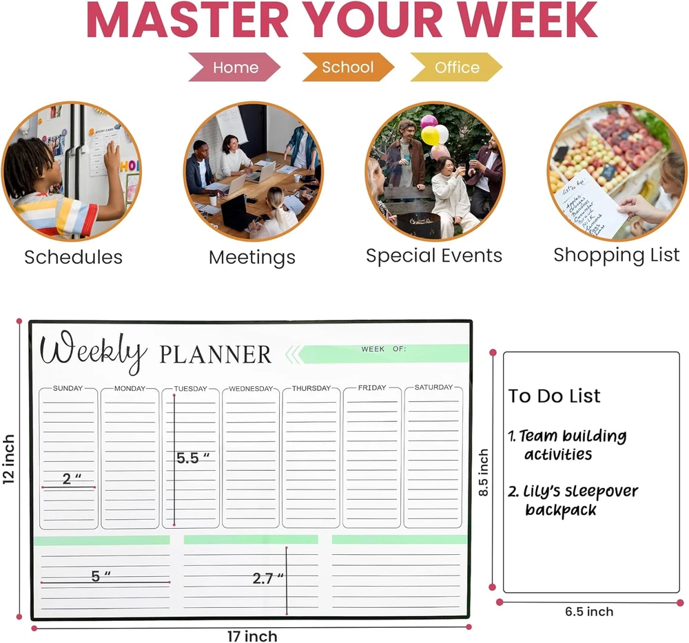 Store New Arrivals Add to Favorite View Feedback Contact Fast deliveries to the customer's home Quality customer service John Make the customers happy! Magnetic Weekly Planner 17 X 12 Inches with Fine Grid – Magnetic Calendar for Fridge with 4 Magnetic Markers, 1 Eraser and 1 Small Dry Erase Board – Perfect Organization for Everyone Description PREMIUM MAGNETIC PLANNER : This 17 x 12" magnetic weekly planner is made with durable PET. The high-quality dry erase calendar makes writing and erasing a breeze, ensuring a clean and organized planner every time. The surface is resistant to stains and ghosting for up to 180 days. Before purchasing it, please test if your metal surface can hold a magnet to ensure it's compatible. PROTECTIVE PACKAGING & MAGNETIC ACCESSORIES : Everything is magnetic. The package includes 1 planner, 1 blank memo board, 4 fine-tip markers, and 1 dry eraser. Each set is perfectly wrapped with a foam pad to protect all accessories and the planner, preventing damage during shipping. MASTER YOUR WEEK : Thoughtfully designed to help you manage your weekly schedule so you don't miss important dates and events. Stay organized, find more personal time for your favorite activities, and enjoy precious time with family! PERFECT FOR SCHOOL AND WORKSPACE : This organizer planner has various uses. It helps everyone plan school schedules, outdoor activities, and more. It is ideal for use on the fridge, at home, at school, or in the office. GREAT FOR FAMILY COMMUNICATION : This weekly planner is a great communication board for family members. Family members can share their schedules and organize to-dos, workout lists, meal plans, and grocery lists. It also helps children be organized and responsible for important dates and events. Product Description Fine Grid Layout Helps everyone plan weekly schedules, outdoor activities, to-dos. Large Grid Layout Helps everyone organize to-dos, workout lists, meal plans, and grocery lists. Undated Boxes Helps everyone manage monthly schedules, bill tracking, appointments. Won't forget important dates. 1 Dry Erase Weekly Calendar 2 Dry Erase Weekly Calendar 3 Dry Erase Monthly Planner Magnetic Dry Erase Calendar Add to Cart Add to Cart Add to Cart Add to Cart Price $23.79 $ 23 . 79 $23.79 $ 23 . 79 $23.79 $ 23 . 79 $23.79 $ 23 . 79 Size 17 x 12" 17 x 12" 17 x 12" 17 x 12" Style Fine Grid Fine Grid Large Grid Undated boxes Reusable ✔ ✔ ✔ ✔ Magnetic Dry Eraser ✔ ✔ ✔ ✔ Magnetic 4 Markers ✔ ✔ ✔ ✔ Extra Small White board ✔ ✔ ✔ ✔ Style fine-grid weekly planner Calendar Type Weekly Format Organizer Color black Material Type Polyethylene Terephthalate Product Dimensions 17"L x 12"W Material Polyethylene Terephthalate Binding Organizer Target Audience Kid, Teacher, Adult, Student, Teen Item Dimensions L x W x Thickness 17"L x 12"W x 0.65"Th Recommended Uses For Product Organization, Planning, School and Work Activities, Family Communication Additional Features Magnetic Surface, Dry Erase, Lightweight, Stain Resistant Special Feature Magnetic Surface, Dry Erase, Lightweight, Stain Resistant Cover Material Vinyl Item Dimensions L x W 17"L x 12"W ABOUT US We offer the best prices around on high quality products. Our E-store includes media such as books, movies, music and games while offering electronics, toys, sporting apparel, clothing, tools, general home, garden items and more. SHIPPING We are always working hard to ensure your package arrives as soon as possible. Please understand that some factors like weather, high postal traffic, and the performance of shipping companies are outside of our control. We offer free shipping to the lower 48 states and ship within 2 business days of payment, usually sooner. We do not accept P.O. Boxes. Please provide a physical address. For shipping outside of the continental USA, we only use eBay's Global Shipping Program. The item is shipped to KY and then sent to the rest of the world. International customers are responsible for all duties and taxes. Continue to 'check out' to calculate costs for shipping the item to your country. Messages regarding eBay's Global Shipping Program MUST be directed at eBay EXCLUSIVELY. RETURNS We offer a 30-Day Return Policy on items in which you are not completely satisfied with. You have the option of a full-refund or an exchange of the item. No returns are available on items shipped outside of the USA PAYMENT We accept PayPal. CONTACT US This page content is yet to come Please ad us to your favorite seller and visit again later Thank You CUSTOMER SATISFACTION We try our very best to make sure every customer is completely satisfied. If there's a problem, message us! We're happy to help. WE ACCEPT