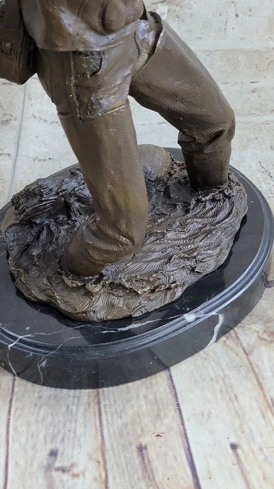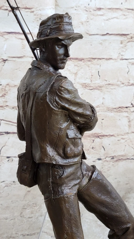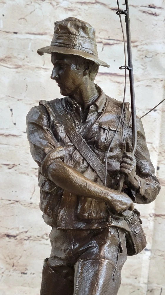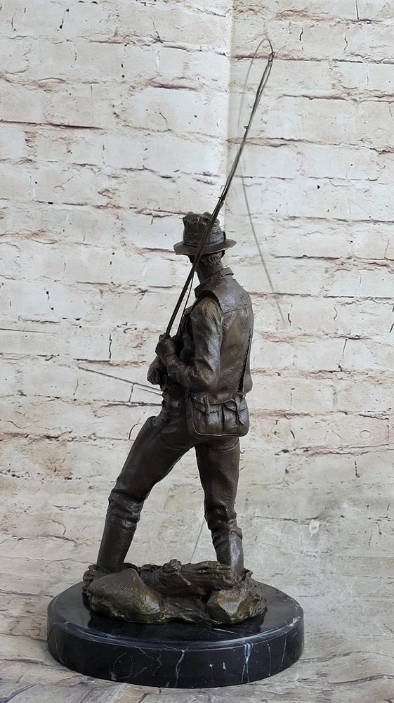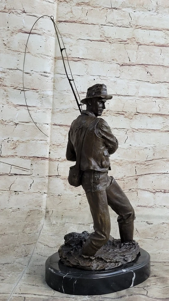 Condition : This sculpture is in perfect condition. Bronze Dimensions with Marble Base: Height 16" X Width 8" Marble Dimensions: Diameter 8" Height without base:15" Weight:10 LBS Inventory:27X24684972 Witness the struggle for survival captured in exquisite bronze artistry with this poignant sculpture. Depicting a man's determination as he fishes with a simple stick, this artwork portrays the resilience of human spirit in the face of adversity. The man's attire, complete with a protective hat and a small bag, underscores his resourcefulness and his battle against the elements while navigating the challenging river. Crafted using the age-old method of lost-wax casting, this sculpture embodies the artist's commitment to preserving the intricate details of the scene. The brown patina finish not only enhances the sculpture's aesthetic appeal but also adds a touch of timelessness to the narrative it conveys. Resting on a sturdy black marble base, this artwork stands as a testament to human fortitude and the enduring power of art to capture the essence of human experience. Signed by the artist Thomas, this bronze sculpture invites viewers to contemplate the struggles and triumphs that define our existence. Whether displayed in a collection or as a standalone piece, it serves as a reminder of the resilience within us all and the stories that art can uniquely convey. Signed Original English Thomas Fisherman Fish Bronze Sculpture Statue Figurine www.bronzhaus.com Video will open in a new window Using the eBay App? Paste link into a browser window: [isdntekvideo]