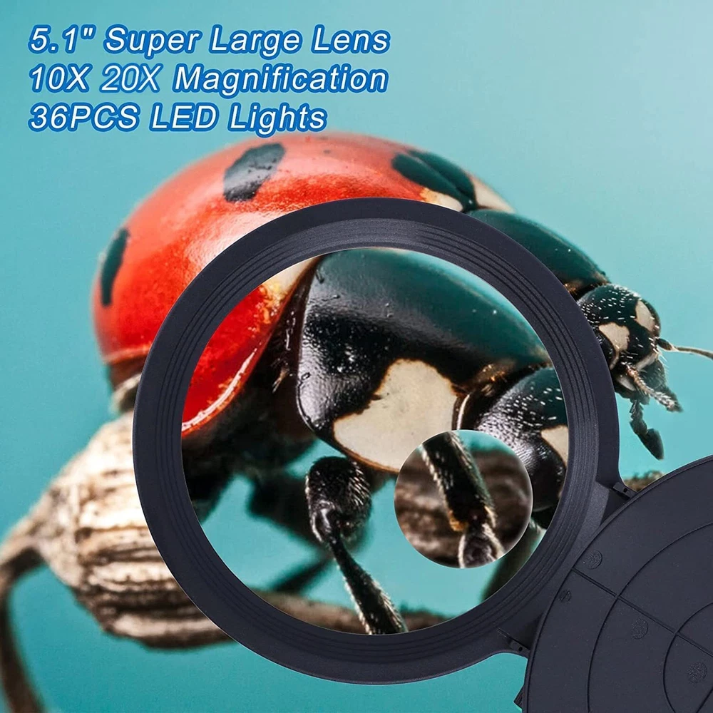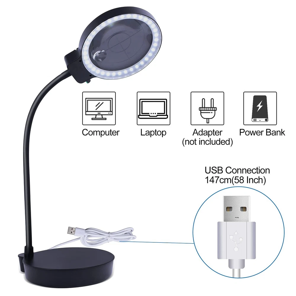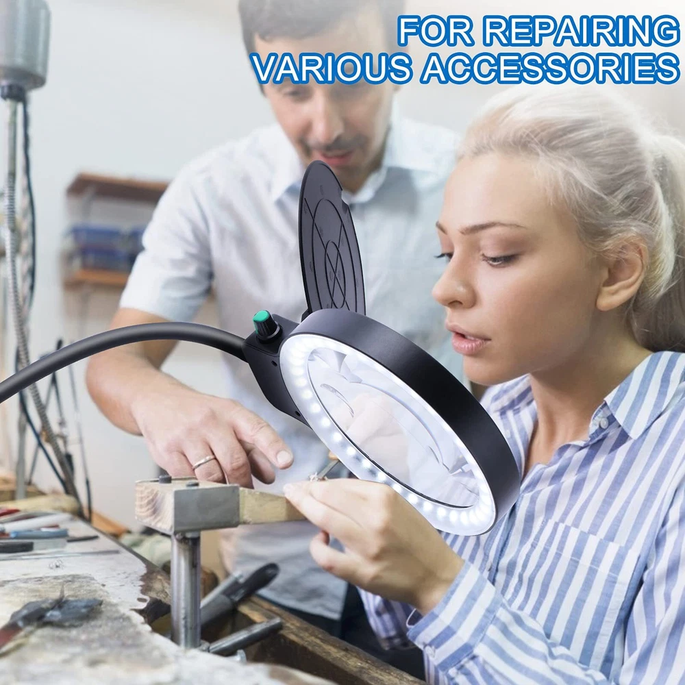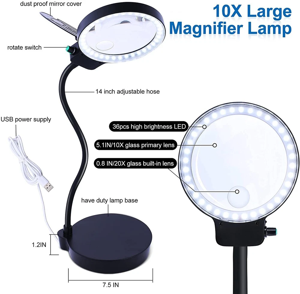 [10X & 20X HD Magnifying Lens] This magnifier glass features powerful 10X and 20X HD glass lenses with anti-glare reflector coverage for magnified and distorted vision.To do this, you need to adjust the height of the magnifying glass to a perfectly balanced position.Keep that in mind. [2 IN 1 Magnifying Glasses with Light for Close Work] You can either use it as an LED lamp, you also can attach it to your workbench as a magnifying lamp. It is a great light for whether working on tiny intricate mechanical systems, or for simply reading small print with ultra clarity. [ 0%-100% Lighted Reading Glasses ] The brightness level of the illuminated magnifier table lamp can be stepless adjusted between 0% to 100%. Can be used as webcam lighting, video conference lighting, zoom lighting for computer and also desk lamp. [ 360° Flexible Gooseneck ] The 360° flexible adjustable magnifying gooseneck reading light allows you to bend and twist to any place without any noise. You can work, read or study anywhere even in bed. [ Dust Prevention & USB Powered Design ] 5.3 inch magnifying glass lens with dust cover. Dust prevention & easy to clean. Plug the USB cable into any available USB port to power the LED, minus the trouble of finding a socket.
