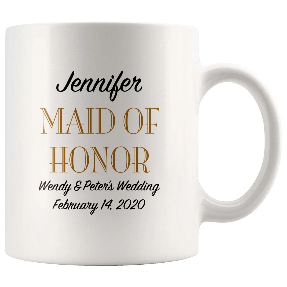 Maid Of Honor Coffee Mug Personalized Wedding Gift White Ceramic Coffee Tea Hot Product Details.. This high quality 11oz. ceramic white mug has a premium hard coat that provides crisp and vibrant color reproduction sure to last for years. Perfect for all hot & cold beverages. The highest quality printing possible is used. It will never fade no matter how many times you wash it. Material: 100% Ceramic. Print both sides. Dishwasher and Microwave Safe. High Gloss + Premium White Finish. Printed in the U.S.A. Personalized & Custom. We support personalized and custom mug to add custom, when placing an order, you can add notes to the "order note" in shipping address section. Also you can contact us directly via message. Shipping Info. Ready to ship in 1 to 2 business days, All products are made-to-order and proudly printed in the United States. Shipped by USPS and DHL, You will receive your order in 5-7 days. Replace & Refund. All products are defective during shipping broken, chipped will be replaced free of charge. You are not satisfied with the product, we will refund 100% money to you. If any other issues arise, please do not hesitate to message, we would be more than happy to assist you.