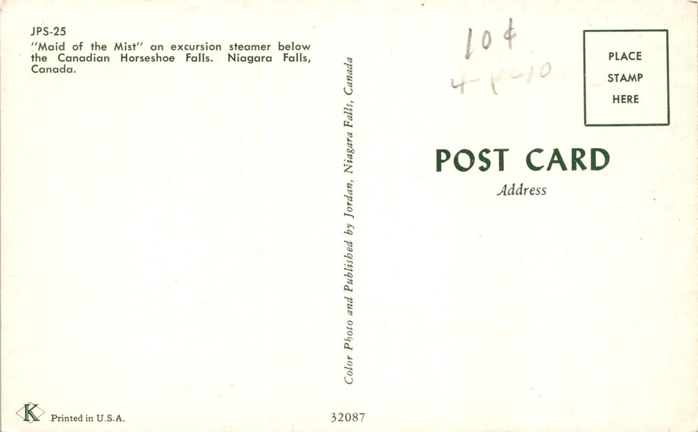 The postcard features a color photo of the Maid of the Mist, an excursion steamer below the Horseshoe Falls at Niagara Falls, Canada. The postcard was printed in the U.S.A. and published by Jordan in Niagara Falls, Canada.