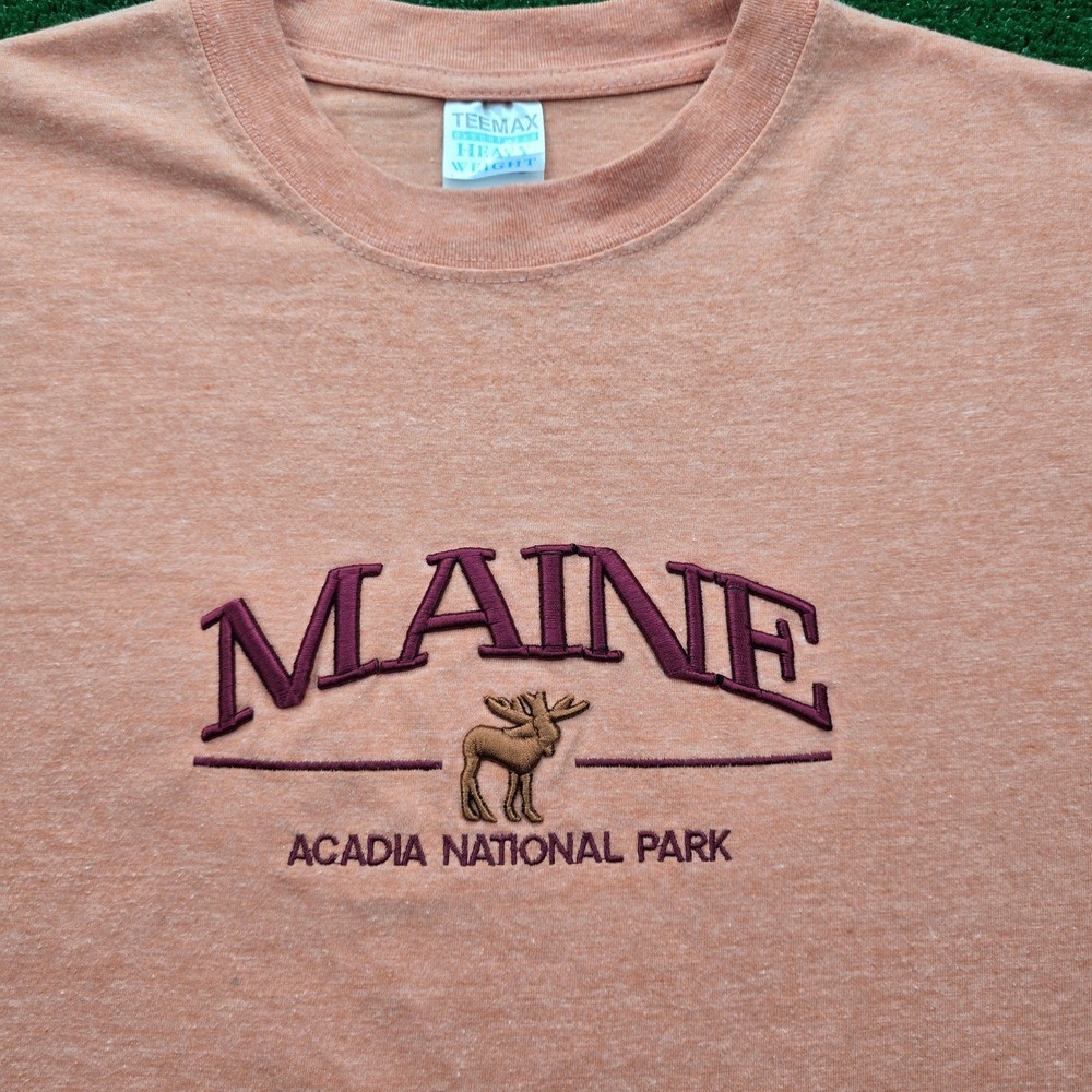 Maine Acadia National Park Tshirt Mens Large Light Orange Moose Embroidered There is a small stain on the front, please see all pictures. Measurements (Inches): -Chest (Pit to Pit): Roughly 21.5" -Length (Top of Shoulder to Hem): Roughly 29" If you have any questions or concerns, please ask before purchasing. Thank you. TXBL80-0526