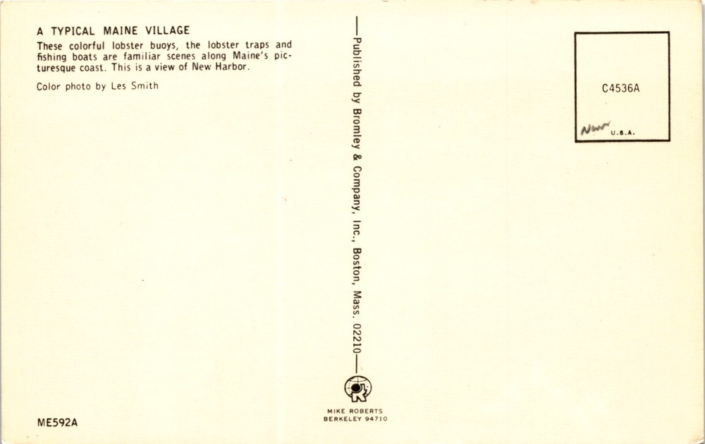 MAKE AN OFFER. THE MORE YOU BUY THE BETTER DEAL I WILL ACCEPT This postcard features a typical Maine village scene in New Harbor, showcasing colorful lobster buoys, lobster traps, and fishing boats. Maine is known for its picturesque coastlines and thriving fishing industry. Lobster fishing is a significant part of Maine's economy, with the state being one of the largest lobster producers in the United States.