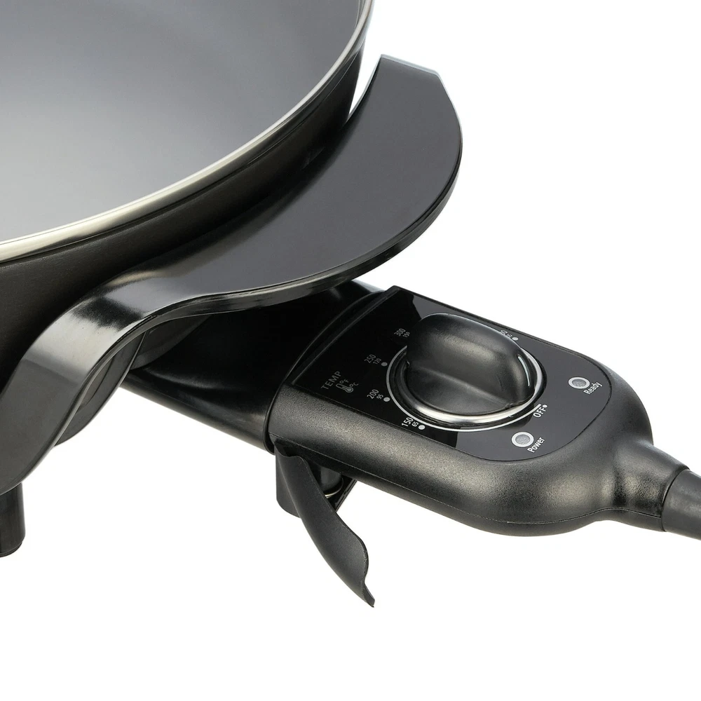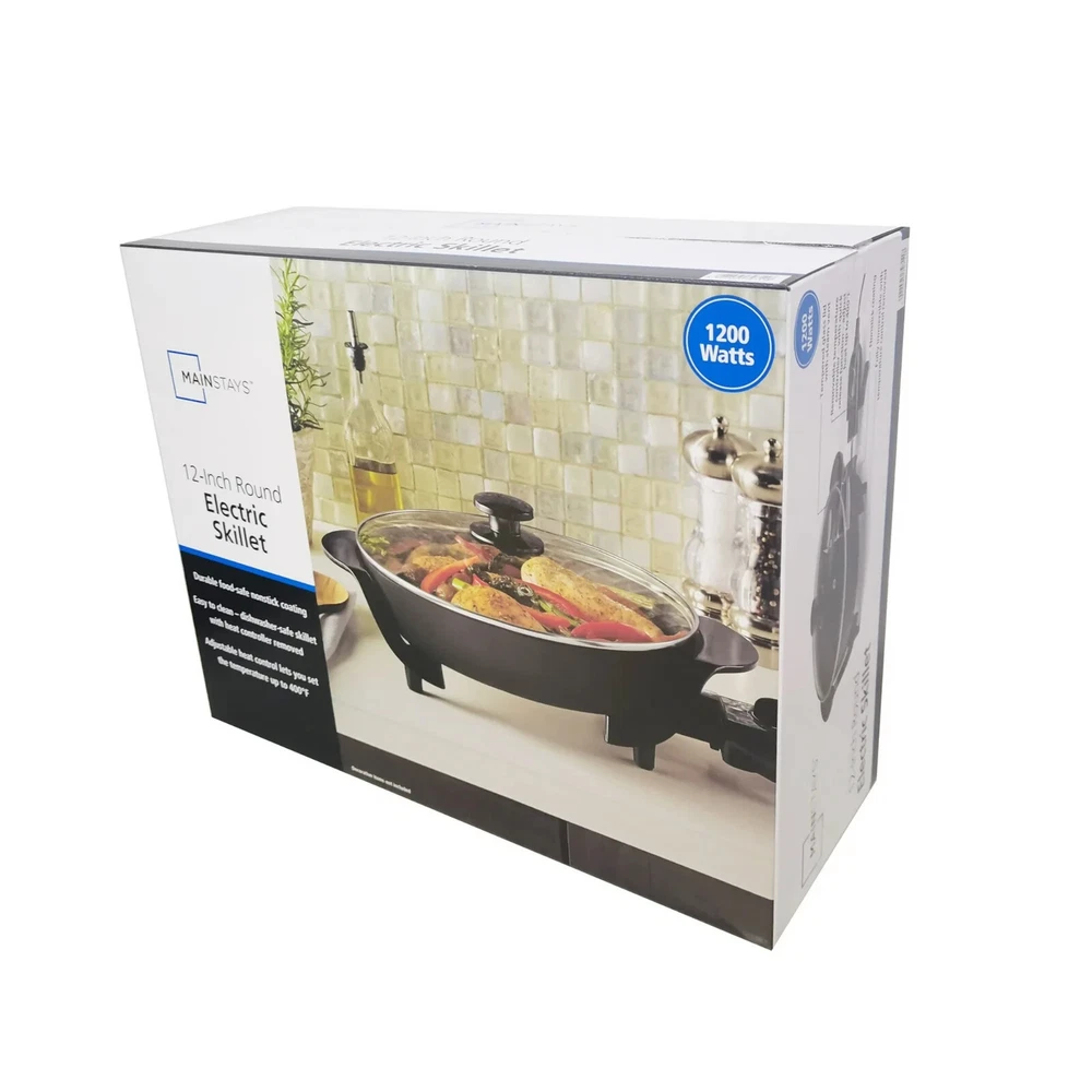 Mainstays 12" Round Nonstick Electric Skillet with Glass Cover, Black Mainstays Versatile 12" electric skillet with adjustable temperature control and glass cover Cool-to-the-touch side handles allow you to pick up the skillet and serve food securely Tempered glass lid allows you to trap moisture while cooking as well as see the food in the skillet Temperature control ranges from 150 to 400 degrees Fahrenheit Large capacity skillet with extra-deep sides holds up to 4.2 quarts, making it ideal for family size meals, one pot meals, as well as entertaining 120V 1200 watts Nonstick cooking surface ensures that foods slide out easily while using less butter, oil, or fat Do not use steel wool, scouring powder pads or abrasive cleaners that may damage nonstick coating. Removable temperature control probe includes temperature dial, power light, and ready light 1-year manufacturer's warranty Skillet and cover are dishwasher safe for easy cleanup (remove temperature control before placing in dishwasher) Skillet heats quickly up to 400 degrees Fahrenheit so you can sauté, sear, braise, and steam your favorite foods Model # 100002052 Cook and serve out of a single appliance for fast weekday meals and easy cleanup NOTE: We do not ship to warehouse addresses We do not ship to island addresses We do not ship to Po Box addresses