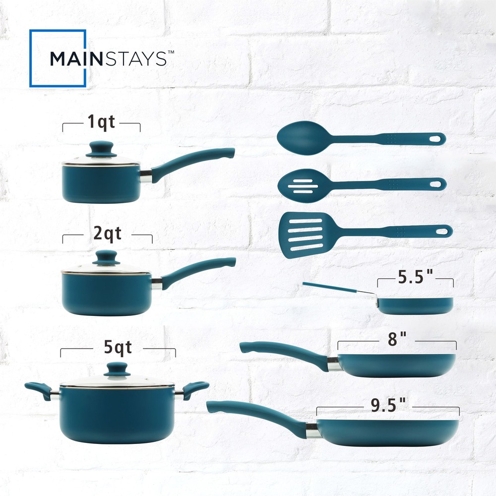 Ideal for everyday use at home, this Mainstays ceramic 12 pieces set corsair includes pans and kitchen utensils that can fulfill your everyday cooking needs at home. It is also ideal as a considerate and valuable gift to your close friends and family. The interior is coated with 2 layers of PPG Customized ceramic coating, which makes cooking and clean-up easy. The pans heat quickly and evenly due to the aluminum body, so this set will help you save time cooking as well. Cool, soft-touch handles provide a comfortable grip., while the outside color of this set will offer a bright of color to your kitchen. Mainstays Classic Collection 12 Piece Nonstick Aluminum Alloy Cookware Set, Blue Aluminum body for fast and even heating Riveted handles for a strong connection Suitable for all cooktops except induction Nonstick ceramic coating for easy cooking and cleanup Includes essential pans and kitchen utensils for versatile cooking
