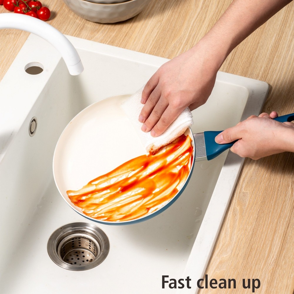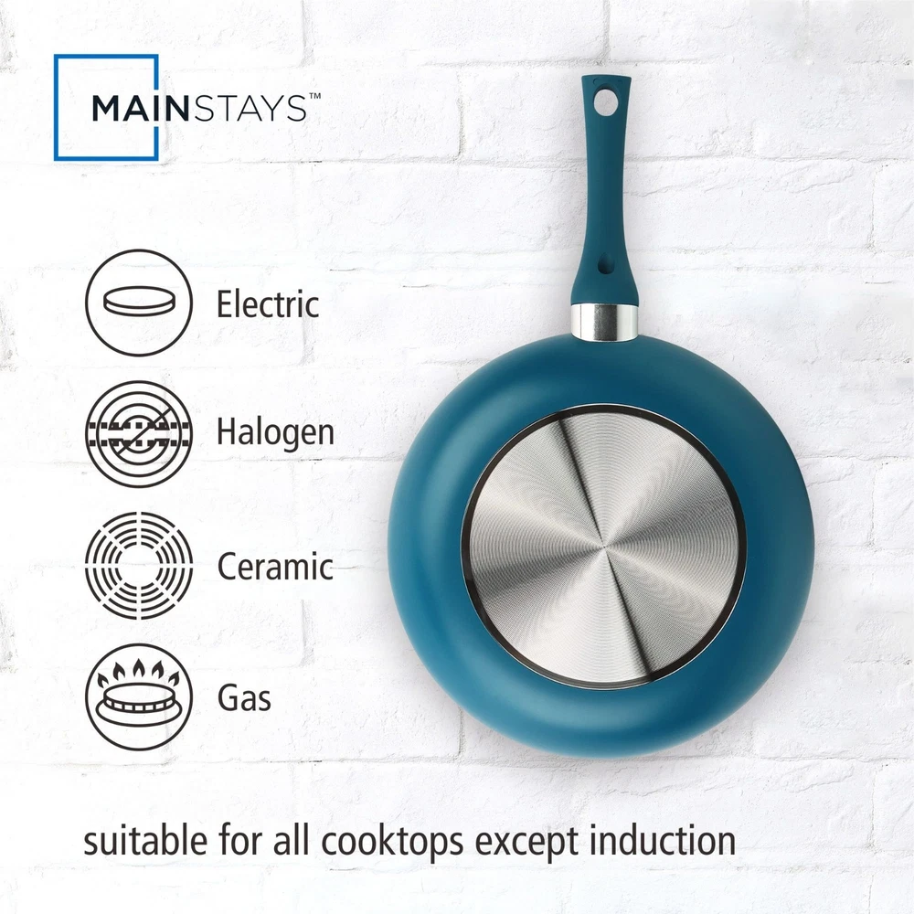 Product details Ideal for everyday use at home, this Mainstays ceramic 12 pieces set corsair includes pans and kitchen utensils that can fulfill your everyday cooking needs at home. It is also ideal as a considerate and valuable gift to your close friends and family. The interior is coated with 2 layers of PPG Customized ceramic coating, which makes cooking and clean-up easy. The pans heat quickly and evenly due to the aluminum body, so this set will help you save time cooking as well. Cool, soft-touch handles provide a comfortable grip., while the outside color of this set will offer a bright pop of color to your kitchen. Mainstays Classic Collection 12 Piece Nonstick Aluminum Alloy Cookware Set, Blue Aluminum body for fast and even heating Riveted handles for a strong connection Suitable for all cooktops except induction Nonstick ceramic coating for easy cooking and cleanup Includes essential pans and kitchen utensils for versatile cooking