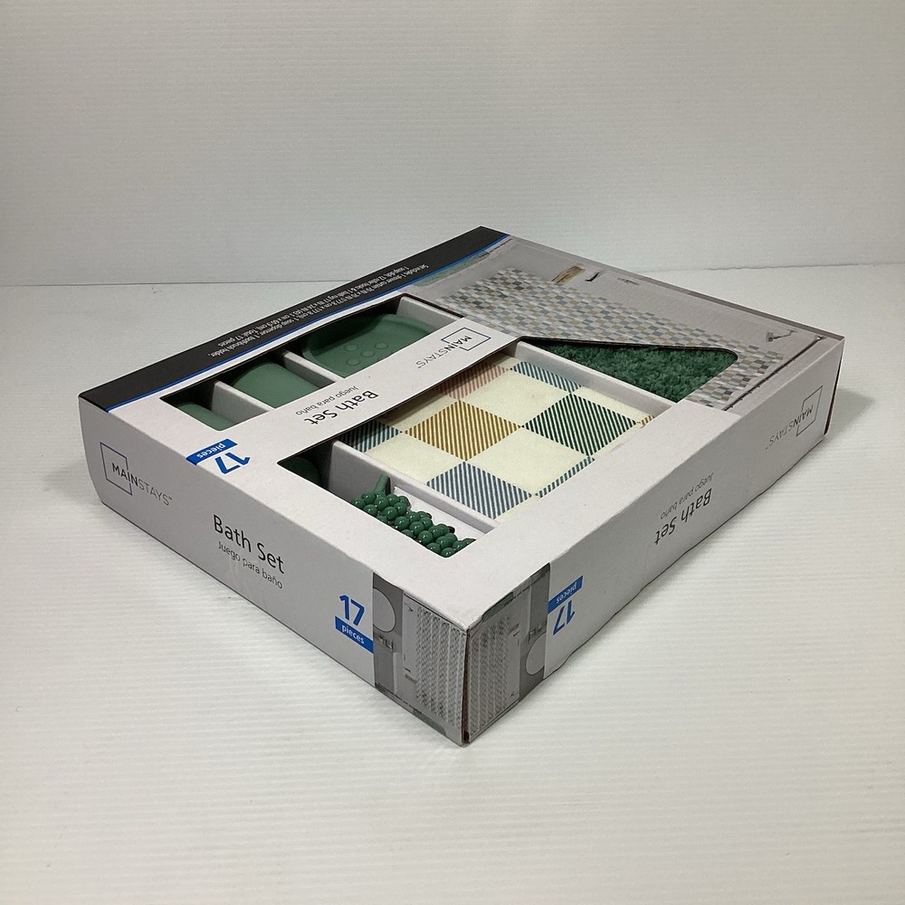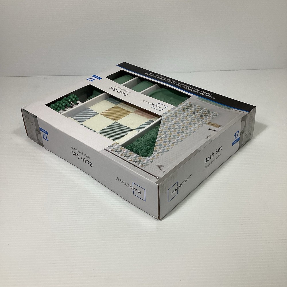 The Mainstays 17 PCS Bathroom Set in Sage is a modern accessory set designed for adults. This new sealed box includes 17 items made from various materials, all in a stylish sage color. The set does not require any assembly and is perfect for adding a touch of elegance to any bathroom. With the trusted Mainstays brand and original design, this set is sure to enhance the functionality and aesthetic of your bathroom space. Comes with 1 shower curtain 70 inch X 70 inch, 1 soap dispenser, 1 toothbrush holder, 1 soap dish, 12 roller hooks and 1 bath rug 17 inch X 24 inch
