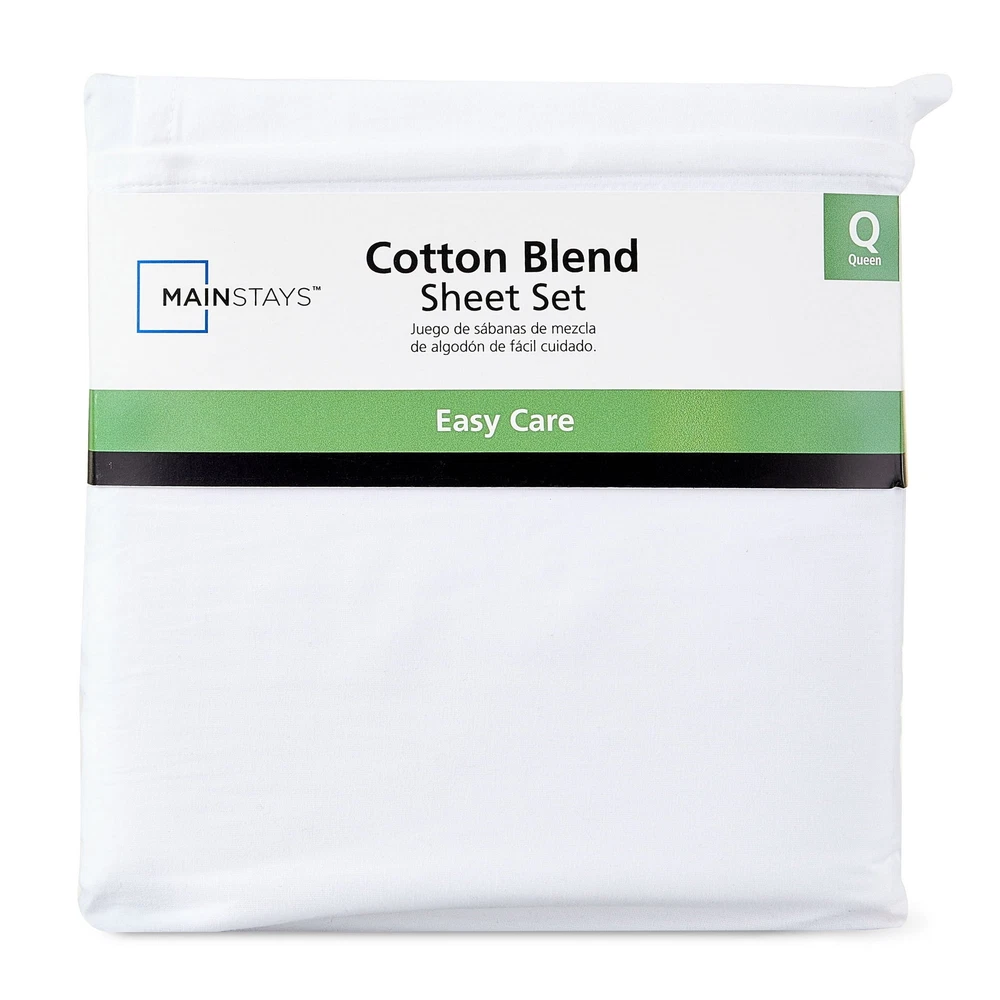 The Mainstays 4-Piece 300 Thread Count White Cotton Bed Sheet Set is a luxurious addition to any bedroom. Made from soft and durable cotton material, this Queen-sized set includes a flat sheet, fitted sheet, and two pillowcases, all in a classic white color. The 300 thread count ensures a comfortable and smooth feel against the skin, making it perfect for a restful night's sleep. Ideal for upgrading your bedding, this sheet set is a practical and stylish choice for any home.