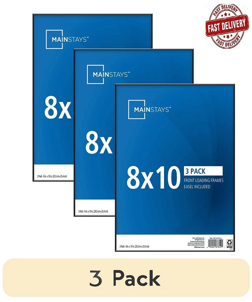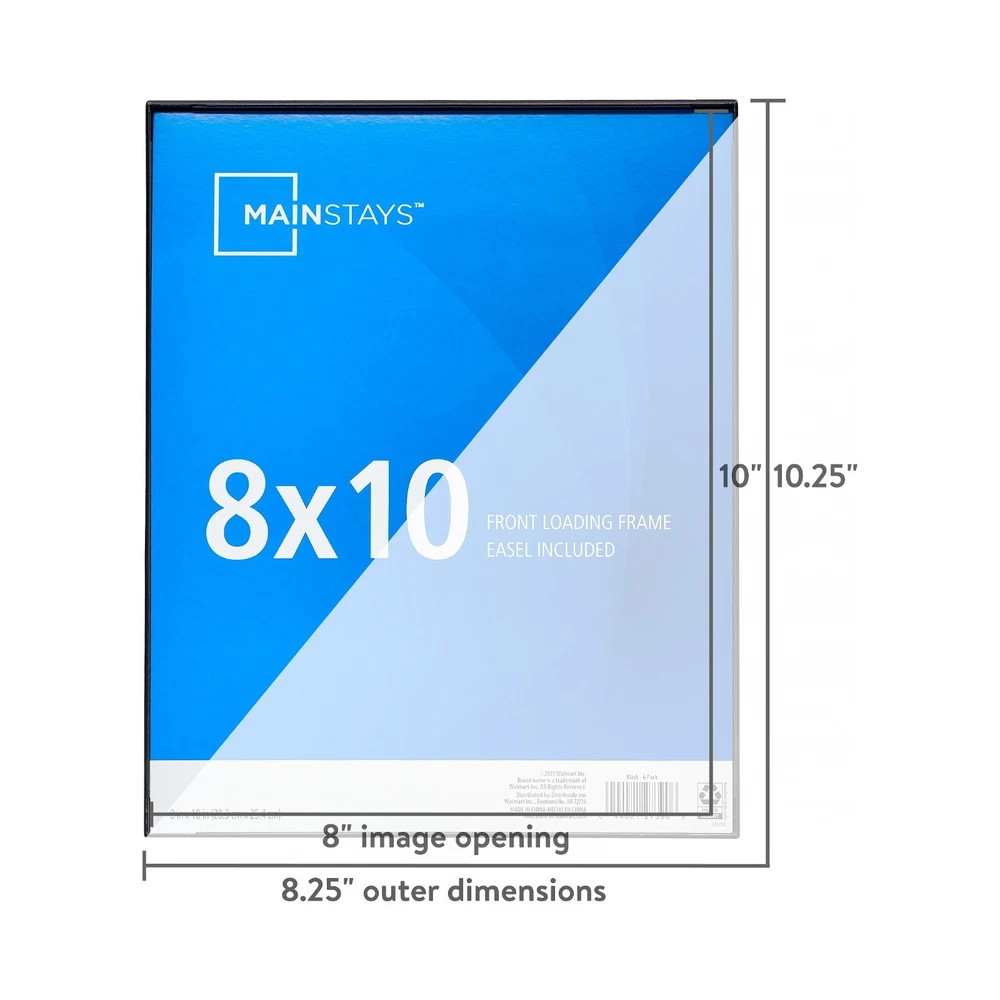 Preserve your favorite memories with the Mainstays 8" x 10" Format Picture Frame. This frame has an easy-to-use, front-loading design. You can hang this Mainstays format picture frame on a wall vertically or horizontally. In addition, you can snap the included easel onto the back of the frame and transform it into a tabletop display. This frames features a clean black finish, which allows it to complement a variety of color schemes. The modern, sophisticated style complements most home or office decor styles. Hang the set together or combine with other sizes (sold separately) to create a beautiful wall gallery full of photos and memories. Mainstays 8"x 10" Format Frame, Black Fits 8" x 10" picture or art print Display photos and art info: We aim to show you accurate product information. Manufacturers, suppliers and others provide what you see here, and we have not verified it Note: To ensure fast delivery, items may arrive in packaging from a fulfillment center or supplier.