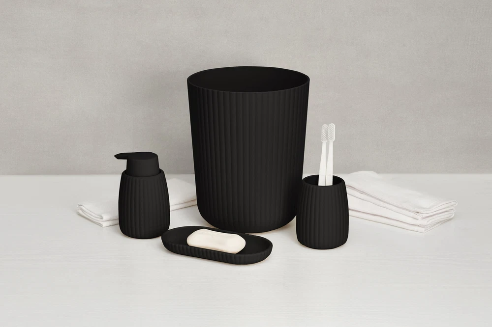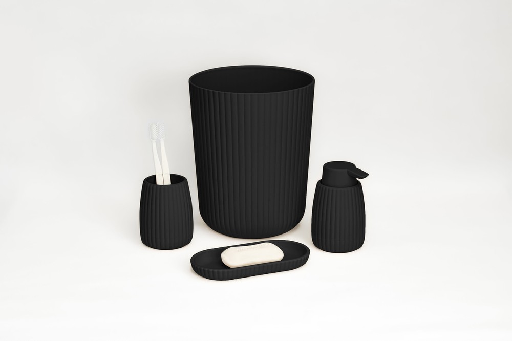 Transform your bathroom into a stylish oasis with the Mainstays Rubberized Plastic Ribbed Bathroom Set. This 4-piece ensemble blends sleek design with practicality, elevating your sink or countertop effortlessly. The ribbed toothbrush holder offers a spacious and secure spot for toothbrushes and other essentials, while its rubberized surface ensures stability and durability. The 1.64-gallon black wastebasket efficiently manages daily waste, adding a subtle texture to your space. Enhance your handwashing experience with the ribbed soap pump, which delivers the perfect amount of soap or lotion with each press, available in four neutral colors. Completing the set is the versatile accessory tray, perfect for organizing your soap pump, toothbrush holder, jewelry, or makeup, while its modern design fits seamlessly into any bathroom decor. Available in four neutral colors, this set combines function and charm, giving your bathroom an instant upgrade. About this item Durable and practical, this 4-piece set includes a toothbrush holder, wastebasket, soap pump, and accessory tray, blending seamlessly with any bathroom decor The set features a sleek, ribbed design that adds a contemporary touch to your bathroom decor while providing practical functionality. This item offers ample space to store toothbrushes, hairbrushes, and other small essentials. The rubberized surface prevents slipping and enhances grip, making it a practical and stylish storage solution. Durable Construction: Crafted from high-quality rubberized plastic, each item in the set is designed for durability and long-lasting use in your bathroom. Any adult will appreciate this bath set On Jul 8, 2025 at 20:22:12 PDT, seller added the following information: