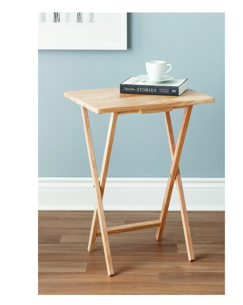 Product details Mainstays Indoor Single Folding TV Tray Table Natural table unfold dimension is L 19 x W 15 x H 26 inches. Mainstays Indoor Single Folding TV Tray Table is made up of 100% solid rubberwood which makes the table durable, sturdy and reliable. Natural color finish Aesthetics: Provide warms natural touch to any space providing versatile looks that compliments various interior styles for any home decor. Folding design of Mainstay table features adds an extra layer of convivence, making it easy to store, or transport the table when not in use. Saving valuable spaces. Mainstays Indoor Single Folding TV Tray weight is 3.54 KG. This Mainstays tables are relatively lightweight, making it manageable to move around, while still offering the stability needed for practical use. Elevate your living space with the Mainstays Indoor Single Folding TV Tray Table in Natural—a stylish, functional, and hassle-free addition made from high-quality 100% solid rubberwood. Order now to enjoy the perfect blend of convenience, durability, and design. Compact and Functional Design: The Mainstays Indoor Single Folding TV Tray Table boasts dimensions of L 19 x W 15 x H 26 inches, providing a convenient and compact surface for a variety of activities. Lightweight and Portable: Weighing just 3.54 KG, this table is designed for easy portability, allowing you to move it effortlessly around your home to meet your dynamic needs. No Assembly Required: Enjoy the ultimate convenience with this TV tray table—no assembly is needed. It arrives fully assembled and ready to use, saving you time and effort. Premium Material: Crafted from 100% solid rubberwood, this table offers not only durability but also a natural and elegant aesthetic. The solid wood construction ensures a stable and reliable surface for your activities. Natural Elegance: The natural finish of the rubberwood adds a touch of warmth and sophistication to your space. Its neutral aesthetic effortlessly complements various decor styles, making it a versatile addition to your home. Versatile Usage: Whether you're enjoying a meal, working on your laptop, or need an extra surface for various activities, this folding table is designed to meet your versatile needs. Space-Saving Folding Feature: When not in use, the table easily folds flat for efficient storage. Perfect for smaller living spaces, this feature allows you to reclaim valuable space when the table is not in use.