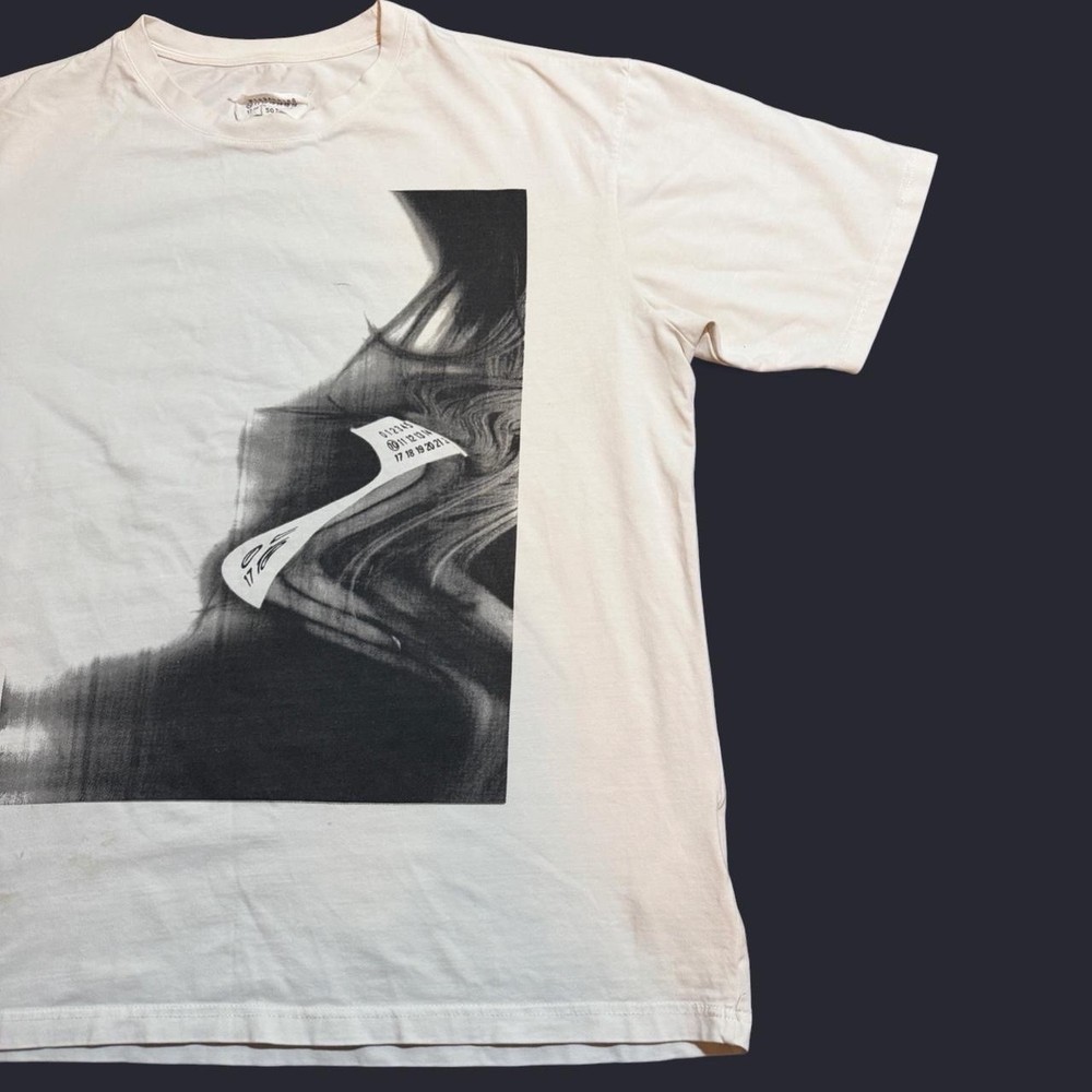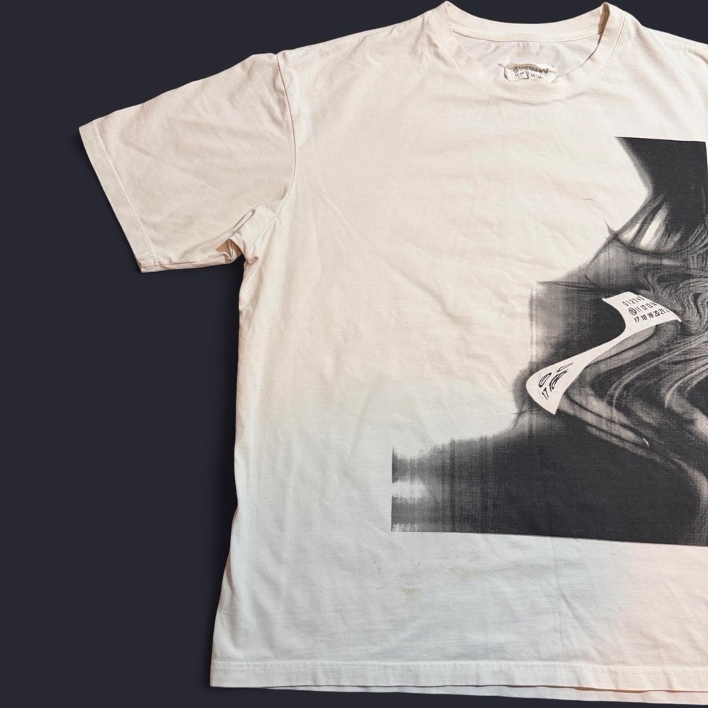 The Maison Margiela Men's T-Shirt in white features an abstract graphic print on the front, showcasing the designer's unique style. Made of cotton jersey fabric, this short sleeve t-shirt has a classic crew neck and a regular fit. Perfect for the summer season, this garment is machine washable and accented with the Maison Margiela logo, adding a touch of luxury to your everyday wardrobe. Made in Italy, this designer t-shirt is a statement piece for any fashion-conscious man.