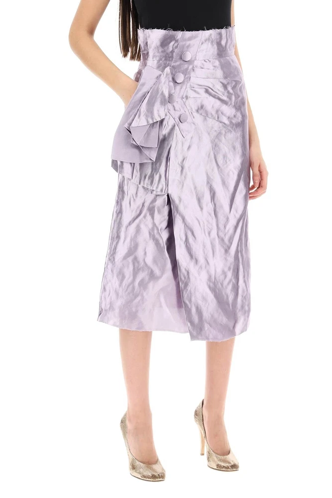 Maison Margiela wrap skirt made of metallic duchesse satin with a crinkled finish. The high-waisted straight cut is embellished with draped detailing and decorative buttons. Featuring a raw edge hem, it has a pocket on the right side and a side zip closure. Iconic 'Four Stitches' detail on the back. Model is 177 cm tall and wears size IT 40. Material: 42%PL 41%ME 12%SE Size Info: IT Color: Metallic Brand Code: S51ME0010 S78555 Season: 2024 Condition: Authentic, Brand New