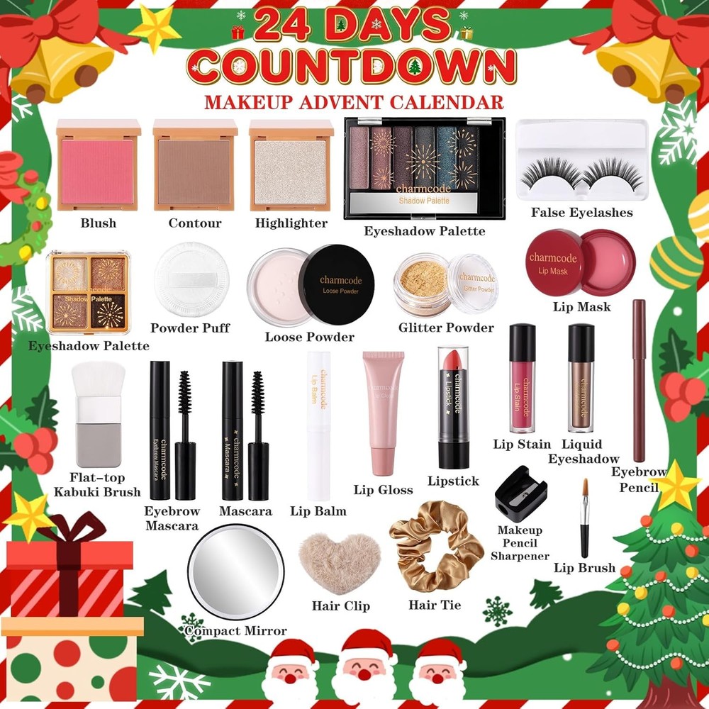 Makeup Advent Calendar 2025 – 24 Days Christmas Make Up Gift Set Multicolor Description Features: 24-Day Cosmetic Advent Calendar – Fun holiday countdown for women and teens! Punch open each numbered window to discover a new Christmas makeup set surprise, making December mornings magical and exciting. All-in-One Makeup Collection –Complete makeup kit with 24 beauty essentials: 2 eyeshadow palettes, liquid eyeshadow, lipstick, lip gloss, lip stain, lip balm, lip mask, blush, contour, highlighter, loose powder, glitter powder, mascara, eyebrow pencil, brow mascara, false eyelashes, powder puff, lip brush, kabuki brush, pencil sharpener, compact mirror, hair tie, and hair clip. A versatile cosmetics set for creating natural everyday looks or glamorous holiday party makeup. Punch-Through Window Design – Interactive Christmas countdown beauty advent calendar with hidden cosmetic treats behind every number. A joyful and shareable experience with friends and family during the festive season. This gonna be a different way to enjoy the magical lead up to Christmas with 24 days of beauty surprises to reveal. Safe & Easy to Use Makeup – Featuring skin-friendly, non-toxic formulas suitable for all skin types. Each product applies smoothly and removes easily, making this cosmetic advent calendar fun and worry-free to enjoy. Perfect Holiday Makeup Kits for Women Full kit – Trendy and festive Christmas present for women, lovers, wife, daughters, sisters, teens, moms, or grandmas. Great for birthdays, Thanksgiving, Wedding, Valentine's Day, Anniversary, stocking stuffers, Secret Santa, or holiday parties. Ideal for makeup beginners and beauty lovers. Provide memorable fun time that also promote the growth of relationship, friendship and family. Product Details: Product Dimensions : 16.93 x 13.39 x 1.3 inches; 1.23 Pounds Manufacturer : CHARMCODE Color: Multicolor Brand: CHARMCODE Item Form: Kit Product Benefits: MAKEUP Skin Tone: All Handling We will ship all orders within 1 business day of payment. Delivery We Do Not Ship Outside of the Continental US. Return Policy All items qualify for returns within 30 days of receipt. Buyer is responsible for return shipping on any item that is not damaged. Feedback We take our reputation seriously, we buy and sell online, so we understand the value of trust. If you are unsatisfied with your order, please contact us and we will work with you to resolve it to your satisfaction.