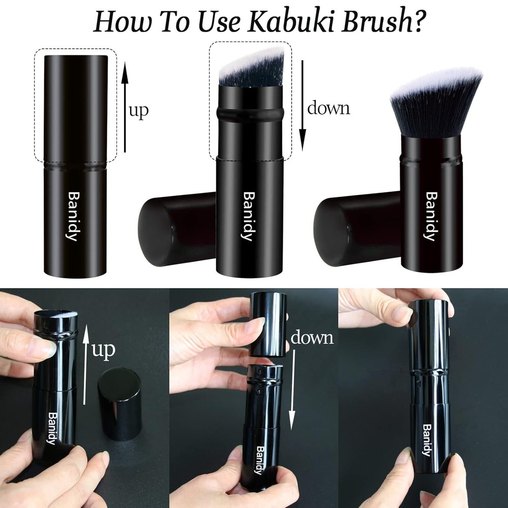 【Travel Friendly 】Kabuki brush is designed to be retractable, sleek, easy to carry, with cover to protect bristles clean. It is portable to tuck into a travel bag or keep in your purse, and convenient to use in home, travel and work. Banidy brush is suitable for liquid foundation and dry powder. 【Cruelty-Free & Vegan 】Bronzer face brush’s bristle is soft and dense, softness and smooth, no Harm or irritation to skin, and no shedding. High density bristles give you the luxurious skin feeling and blend foundation seamlessly, even the sensitive skin. 【Multi-Purpose & Perfect 】Retractable makeup brush is perfect for daily makeup or professional makeup, home makeup or work makeup, and travel makeup. Travel makeup brush is suitable for full coverage of powder foundations, mineral blending, contouring and finishing. Make your makeup more natural and perfect. 【Stylish & Easy to Clean 】Kabuki brush for powder foundation is made with retractable baking paint aluminum tube, more lightweight, durable and beautiful. It is the best gift for your friend and family. 【High Quality 】Travel powder brush is not only liquid and cream, but also for power products. There is no problem for using it for foundation, contour and highlight. The foundation brush make your makeup more perfect. Warm tip: How to get cap on: Step 1: Pull the aluminum tube upward, and the scattered brush head will naturally shrink; Step 2:Get the cap on; Step 3: Pull down the aluminum tube. It is very simple.