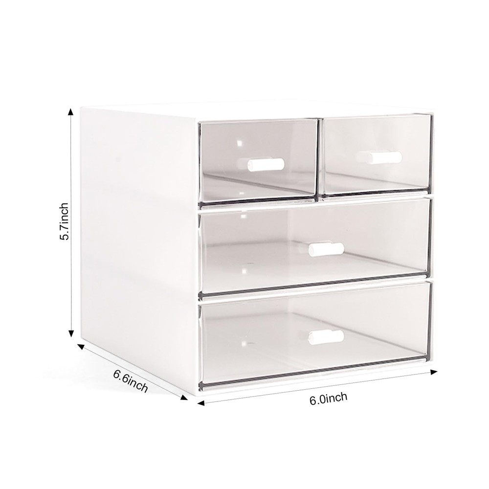 Material: Makeup organizer is made of ABS plastic. Easily Find What You Need: Makeup Organizer with 4 Transparent Drawers. Size: 6*6.6*5.7 inches. Versatile Design: This Desktop storage is not only perfect for storing your makeup brushes, nail polishes, Liquid Foundation, lipsticks and other small personal items but also great for storing your desktop stationery such as paper clips, pencil, scissors, binder clips and many other office supplies; you can put any other daily necessities on the Desktop storage. Widely Used: Fits Bedroom Countertop Bathroom and office, especially the makeup table.