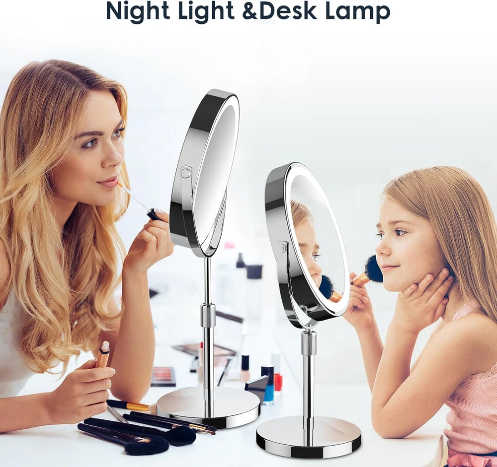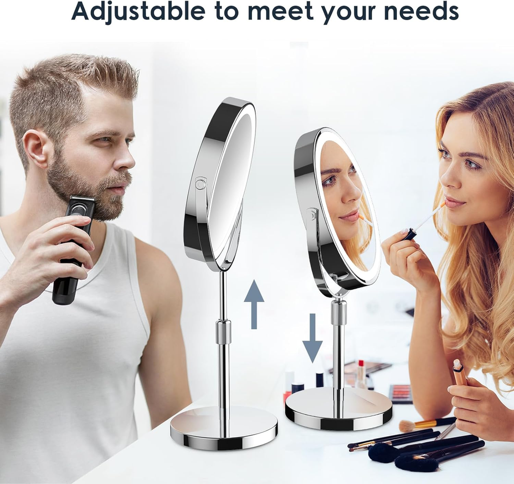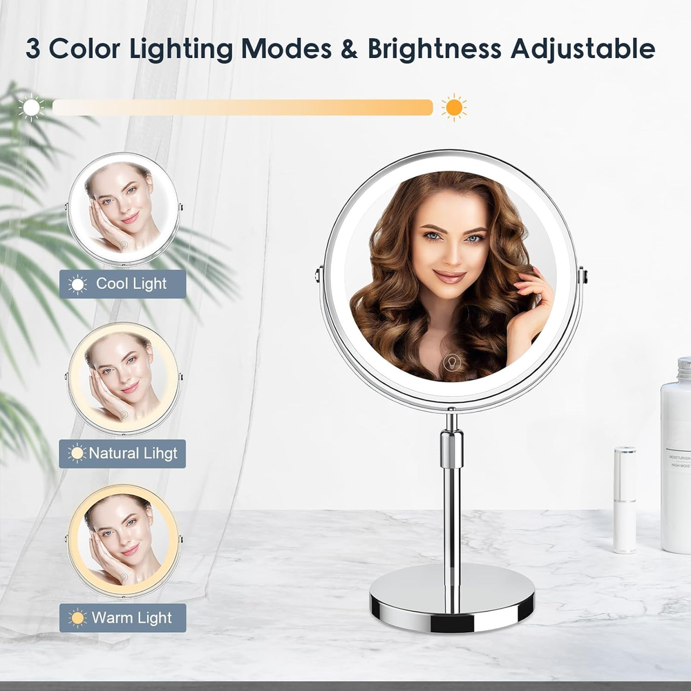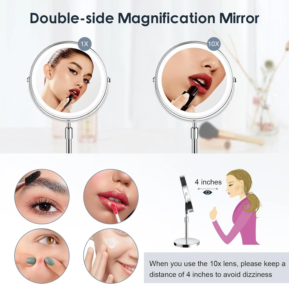 14''-17'' Height Adjustable and 360° Rotatable For Most people:Our makeup mirror is perfect for use in your home. It features adjustable height ranging from 14'' to 17'', allowing you to customize it to fit your dresser or vanity height. The 360° rotatable design ensures you can find the perfect angle with ease. Ideal for both men and women. 80 Lamp Beads and Built-in 3000 mAh Battery:The LED makeup mirror is equipped with 80 lamp beads that deliver ultra-bright light. This mirror not only enhances natural light during the day, but also provides ample illumination in darker settings at night. Additionally, the mirror features a built-in 3000 mAh rechargeable battery that provides over 10 hours of continuous usage once fully charged. 1X/10X Magnifying Double Side:With 1X/10X magnification, the classic dual-sided design of lighted makeup mirror with magnification makes achieving a flawless makeup look a breeze. Both sides are perfect for makeup application as well as detailed tasks such as wearing contact lenses, shaping eyebrows, shaving, styling hair, facial treatments, and applying mascara. 3 Color Lights and Stepless Brightness:This makeup mirror with lights offers natural light, warm light, cold light, and adjustable brightness to ensure soft, uniform illumination that reaches every corner of your face. Simply tap the sensor switch to switch between light colors and hold it down to adjust the brightness level, catering to your specific needs in various settings. Great Gifts and Quality Assurance:Whether you're looking for the perfect present for Mother's Day, Valentine's Day, birthdays, or Christmas, our vanity mirror with lights is a fantastic gift option for the important women in your life, such as girlfriends and family members.And we offer 1-year quality assurance, if you have any questions in use, please contact us. Product Description 360° Rotatable Mirror Designed with 360° rotation, makeup mirror with lights can be freely adjusted to any angle, making it clearer and easier to check your makeup or skincare. Meet different lighting Needs This makeup mirror with lights offers natural light, warm light, cold light, and adjustable brightness to ensure soft, uniform illumination that reaches every corner of your face. Supper Bright Light and Last Long This makeup mirror built-in 3000 mAh battery with 80 lamp beads that deliver ultra-bright light. It provides over 10 hours of continuous usage once fully charged.