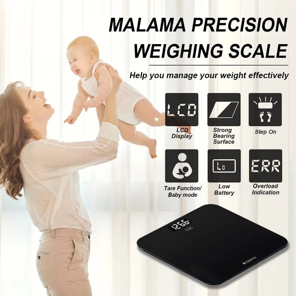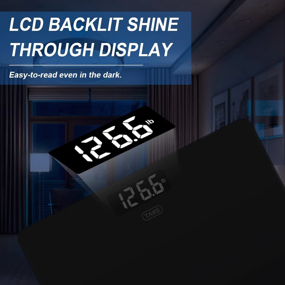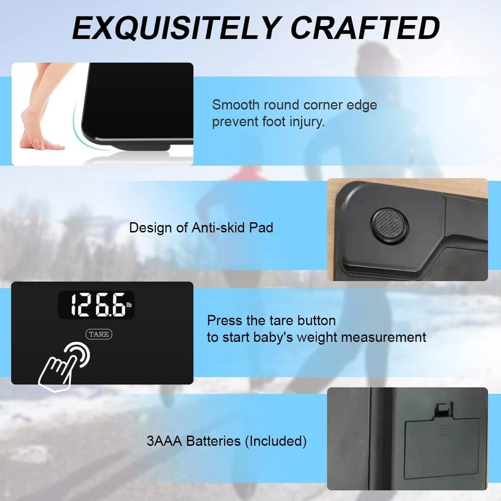 4 MOST ADVANCED HIGH-PRECISION SENSORS: Deliver results with a 0.2 lb accuracy resolution. For best accuracy, please place the scale on a hard, flat surface. Avoid carpet or soft surface. CONVENIENT BABY MODE: Tare function allows you to zero out adults and measure the baby's weight when carrying baby, perfect for getting measurements before and after feeding, helps track baby or pet's growth. HIGH-END FUCTIONS: Auto-zero, Auto-on and Auto-off. Includes low battery and overload indication to maximize battery life and extend product lifespan, 3-unit modes (kg, lb, st:lb), 3 AAA batteries included. SMART STEP-ON TECHNOLOGY: Scale calibrates itself automatically, instant accurate readout as soon as you step on the scale. Elegance and simplicity design with extra large easy-to-read LCD back lit screen, easy to read even in the most dimly lit areas. SAFETY AND COMFORT: Strong tempered glass weighing platform supports up to 400 lbs/180 kg. Non-slip feet and scratch-resistant feet to keep the scale in place without damaging your floors.