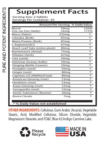Male Virility with Maca, Tribulus, Cutuaba, Muira Puama, L-Arginine HCI Male Enhancement Pills (1 Bottle, 60 Tablets) Description Sexual problems are the prime problems of males are facing now a days. An easy solution to this is Male enhancement pills which will not only help you to deal with the disability but also increase your size, stamina and pleasure. These pills are made from ingredients that do not impose any harm to the body. Take these pills before sex and enjoy the pleasure to the maximum intensity. Various men are still hesitant to use them because they are unaware of the benefits of these pills. Increased Self Confidence-These pills not only increase the confidence in the bedroom but also enhances our self esteem. When you will be confident about your performance in the bed this will make you more desirable in the eyes of women. The natural male enhancement pills should be coupled up with male enhancement exercise for a permanent solution. These pills and exercise if combined work together in the body, complementing each other to make the desired changes to your male part or do away with any mans problem. As written above these natural male enhancement pills are made from natural herbs so these impose no harm to body tissues. They are perfectly safe and reliable. That is why it is always advisable to choose natural ones than synthetic ones. You can see yourself that natural pills have innumerable benefits over the medical pills. If you are going for a normal Male enhancement pill, it is always advisable to consult a doctor before buying them. Now the decision lies in your hand which one you want to choose but keep in mind by choosing a natural one you will be making a wise decision. Maca Benefits Everyone knows that within the center age, men encounter several slowing down of male libido situations. That is the interval in a man’s life when noticeable signs of getting old start to appear in men. This period known as andropause. Maca root can be named “Peruvian ginseng”. Maca is the answer for fixing males issues with libido. Be at liberty to attempt it and see for yourself. The underside line is that andropause is a really real medical condition that has a really actual and really negative impact on males’s lives. Men live longer today and want to continue having fun with healthy relationships. Maca root can enhance a person’s stamina, or lasting power, within the bed room, in addition to enhance his total energy. maca impacts sperm manufacturing discovered that the root increased the volume of semen and sperm count. Cutuaba Benefits Catuaba bark is said to have been discovered by the Tupi Indians and used initially for enhancing the libido. The herb was originally boiled to make tea, but today it is available as a capsule and can be found at health food stores or some pharmacies. Though the effectiveness is not scientifically proven, it is said to work by stimulating the nervous system and aiding with genital function. Catuaba bark is said to enhance the mood, aiding with symptoms of depression and . The herb is also known as Caramuru, Golden Trumpet, Chuchuhuasha, Erythroxylum catuaba, Pau De Reposta, Piratancara and Tatuaba. It may be effective for boosting the mood due to the feelings of euphoria that are said to result from use. Catuaba bark is also said to have antibacterial and antiviral properties, which may aid those with existing conditions or in fending off bacteria. In Brazil, the bark is dropped into a bottle of rum, which is said to draw out its properties. For those supplementing with the herb, the effects are said to be experienced within weeks of regular use. According Dr. Meira Penna, when used as an aphrodisiac, the catuaba bark is innocent, as it can be used without any ill effects at all. Suggested Use: 2 Tablets daily preferable with a meal or directed by a healthcare professional. *These statements has not been evaluated by FDA. This product is not intended to diagnose, treat, cure, or prevent any disease. GREAT QUALITY PRODUCT