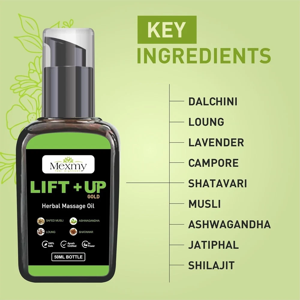 MEXMY Feel Eighteen Lift-Up Massage Oil for Men - 50 ml Revitalize your body and mind with MEXMY Feel Eighteen Lift-Up Massage Oil, specially formulated for men seeking an invigorating and refreshing experience. This 100% pure and natural Ayurvedic oil is designed to enhance vitality and promote a sense of well-being. Key Features: 100% Pure and Natural : Crafted from high-quality botanical ingredients, ensuring you receive only the best for your body. Ayurvedic Formula : Blends traditional wisdom with modern care, providing holistic benefits that support overall health. Invigorating Lift-Up Effect : This unique formula helps uplift and energize, leaving you feeling revitalized and rejuvenated. Easy to Use : Ideal for daily massage, promoting relaxation while enhancing circulation and muscle recovery. Suggested Use: Massage a small amount onto the desired areas of your body. For best results, use regularly, especially after workouts or long days. Quality Assurance: MEXMY is committed to providing premium products, free from artificial additives and harmful chemicals. Enjoy the natural benefits of this Ayurvedic massage oil, designed to support your active lifestyle. Elevate your self-care routine with MEXMY Feel Eighteen Lift-Up Massage Oil, and experience the invigorating power of nature!
